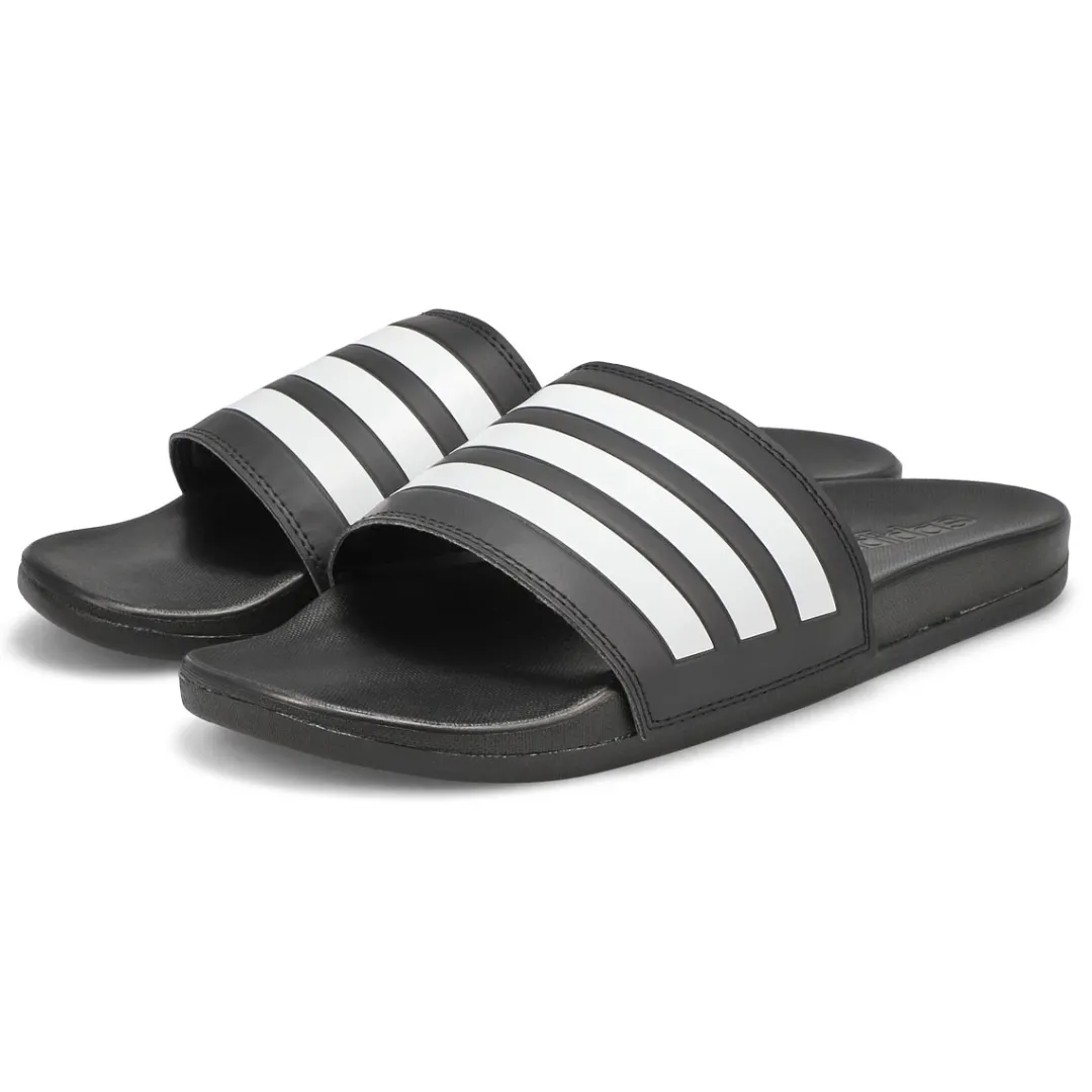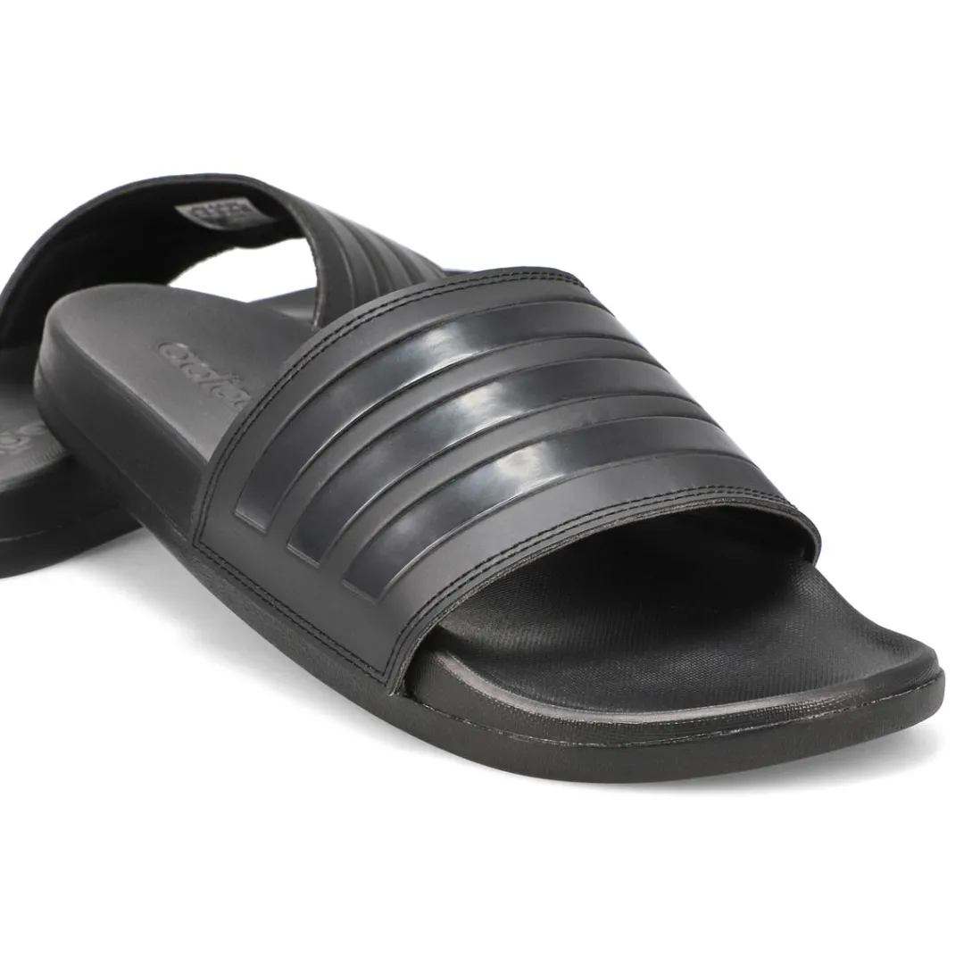 From the beach to the street. These slip-on slides have a pillow-like cushioned footbed for optimal comfort. The bandage-style upper offers a lightweight feel. Features a synthetic upper with a quick dry lining. Slip-on construction in a contoured Cloudfoam Plus footbed. Lightweight EVA outsole. Make the Adilette black/ black sport slide from Adidas part of your must-have wardrobe this season!