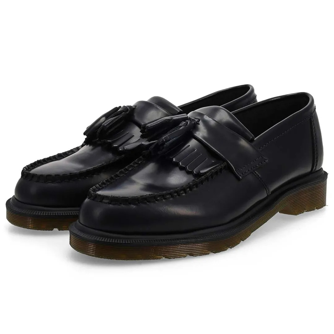 Manufactured at the original Dr. Martens Cobbs Lane factory, The Adrian Tassel black Casual Loafer first from Dr. Martens’ hit the streets in 1980. And with a double tassel and kiltie fringe, the traditional unisex slip-on loafer has been a classic since day one. Now, it comes in a high-shine two-tone leather: Arcadia.