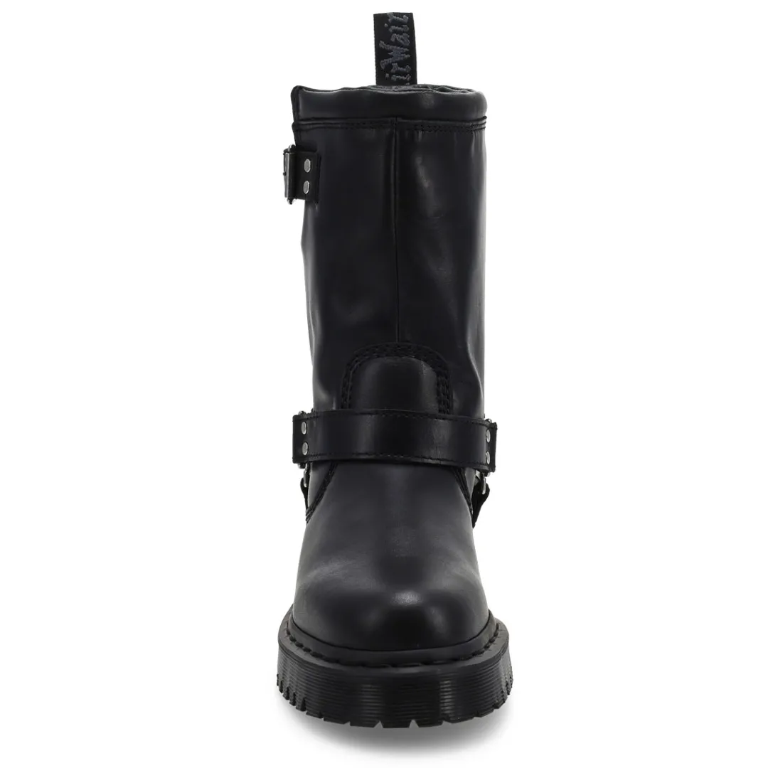 The Anistone Hi Biker Boot is built from Wanama leather and fitted with industrial-inspired hardware including branded metal plates and an adjustable buckle. Wanama is a lightweight leather with a satin-sheen finish. Set on Dr. Martens’ elevated Bex sole with signature DMs grooving and yellow welt stitching. Tagged with Dr. Martens’ unmistakable black and yellow heel loop.