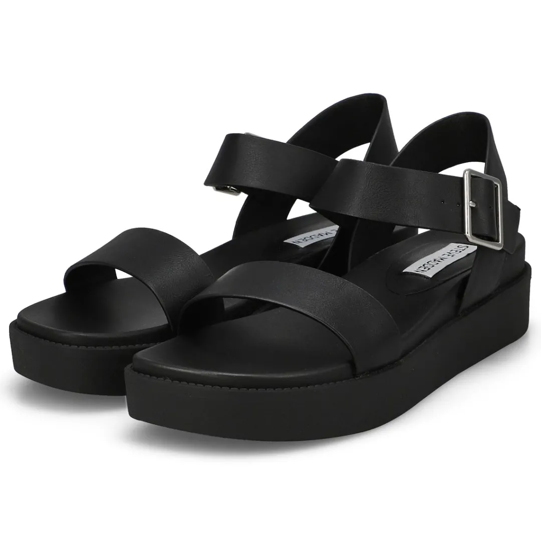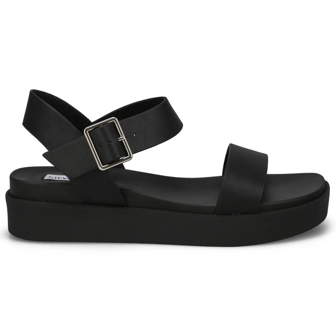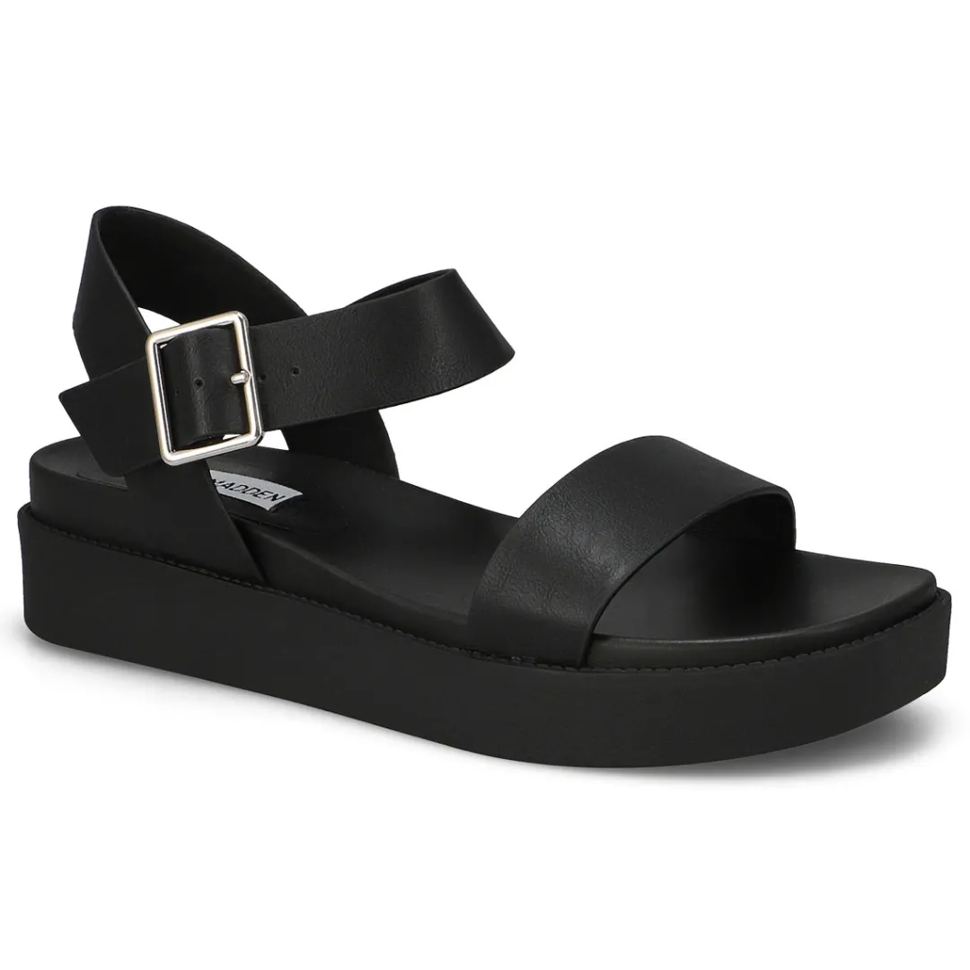 Perfectly simple and as classic as they come, the Annie black fashion sandal from Steve Madden features a simple two-strap upper. Buckle yourself into this timeless style to complement practically any warm weather look and show off your latest pedi! Featuring a soft PU upper with a durable rubber outsole.