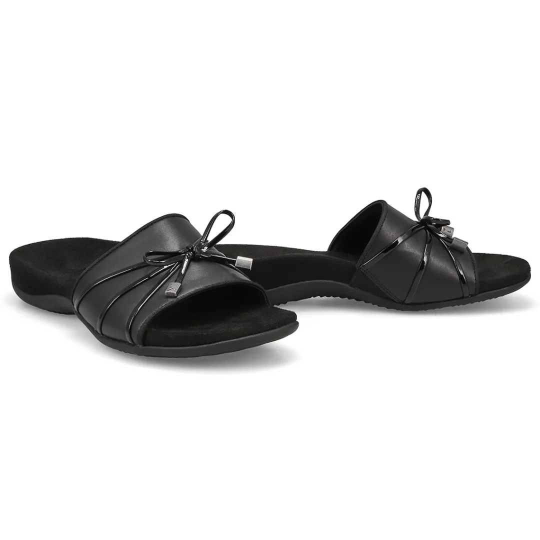 The perfect mix of ease and style, the Bella Slide black slip on sandal from Vionic features their classic supportive footbed and the signature Bella bow accent. Designed with exclusive alignment technology to balance the whole you. Lightweight, flexible EVA midsole absorbs shock, reducing stress on feet, ankles, and knees. Built-in VIO MOTION Technology footbed featuring contoured arch support, with shock-absorbing cushioning, deep heel cup to provide stability, and forefoot flexibility.