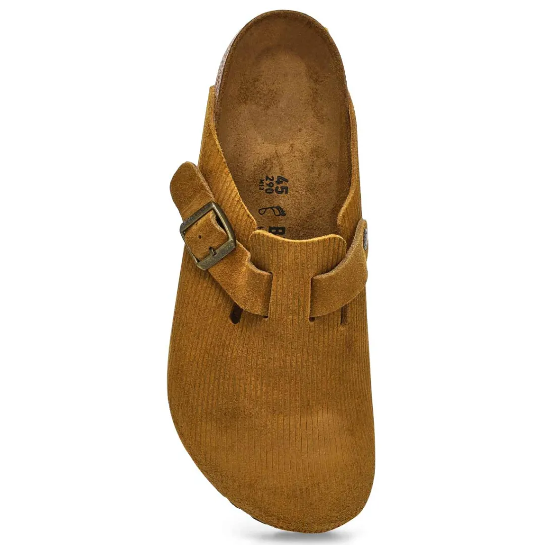 The Boston corduroy suede casual clog from Birkenstock with a soft cushioned footbed provides excellent arch support. Durable EVA outsole, cork footbed molds to each individual foot to provide a custom fit. This Birkenstock sandal is a genuine classic, emphasizing the handcrafted and natural look of stylish sandals. A comfort legend and a fashion staple.