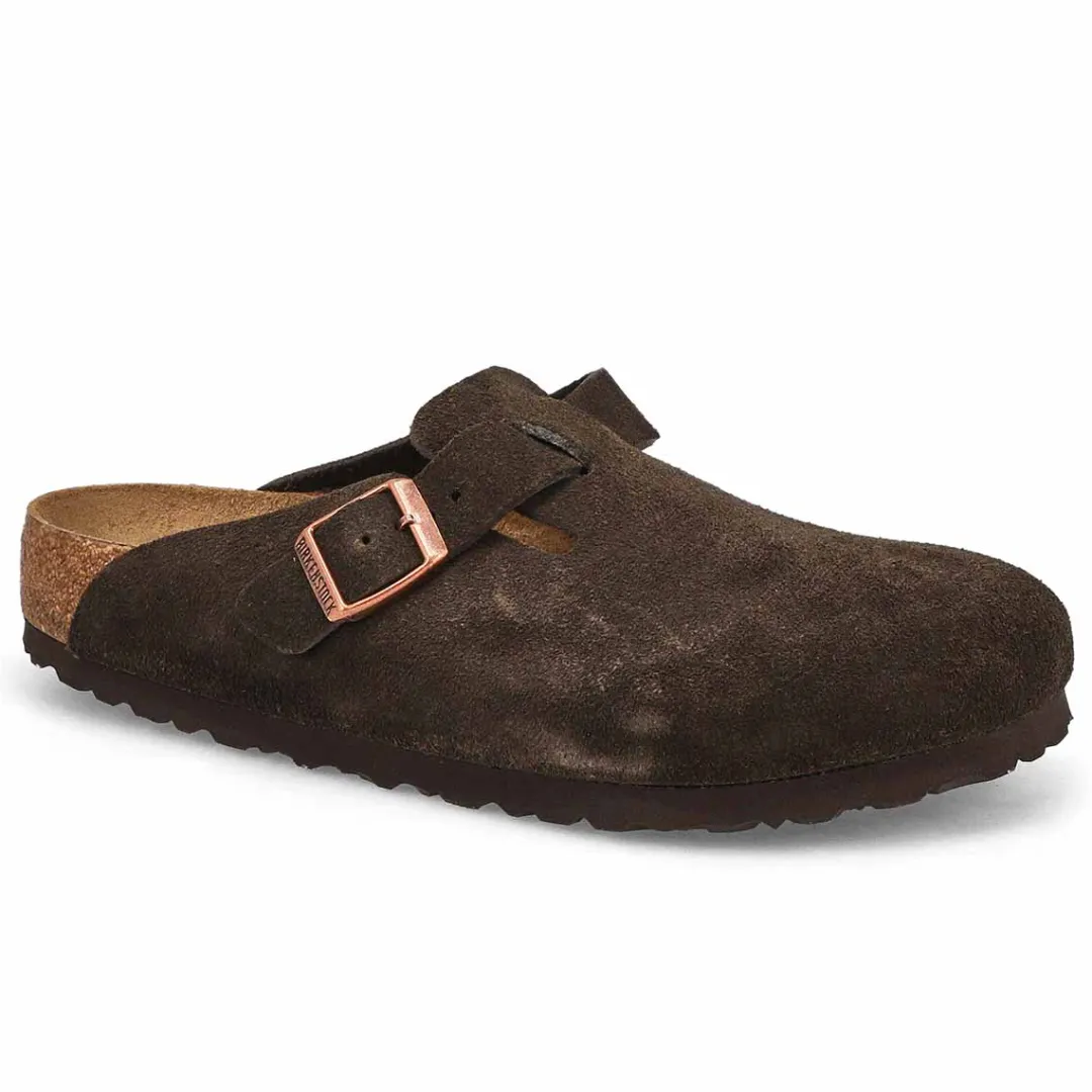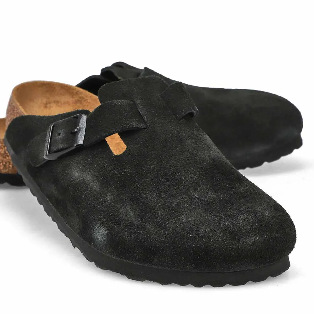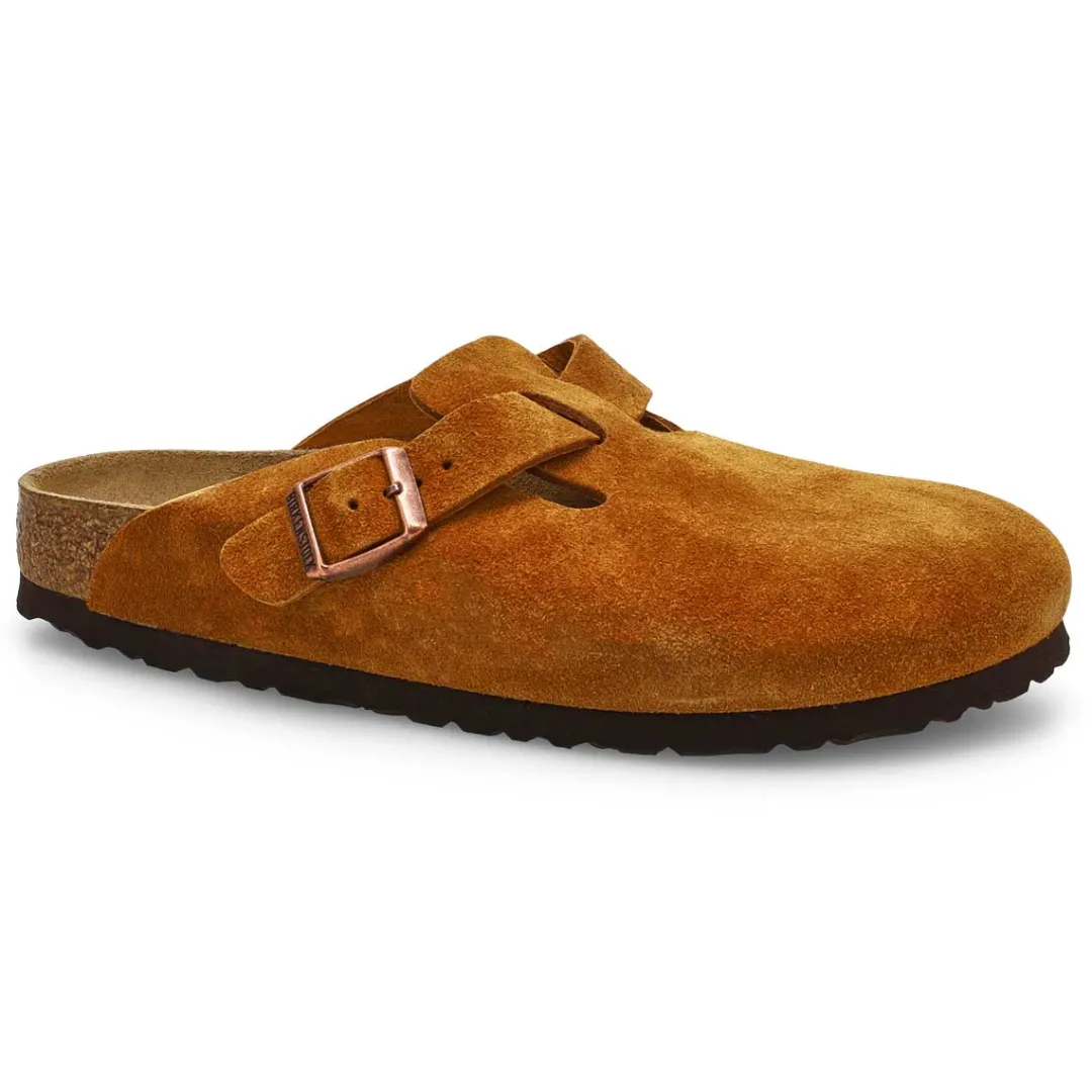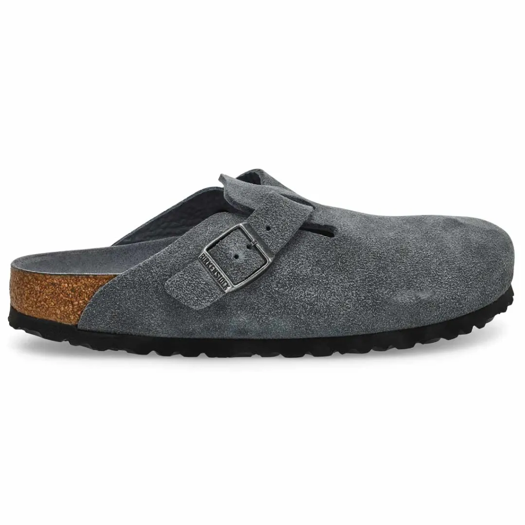 The Boston suede casual clog from Birkenstock with a soft cushioned footbed provides excellent arch support. Durable EVA outsole, cork footbed molds to each individual foot to provide a custom fit. This Birkenstock sandal is a genuine classic, emphasizing the handcrafted and natural look of stylish sandals. A comfort legend and a fashion staple. Narrow Width.