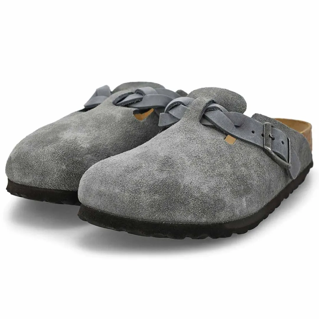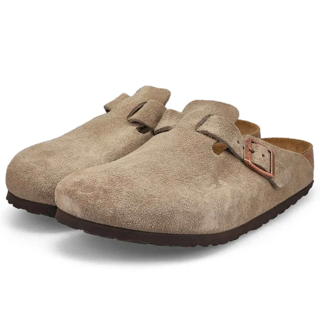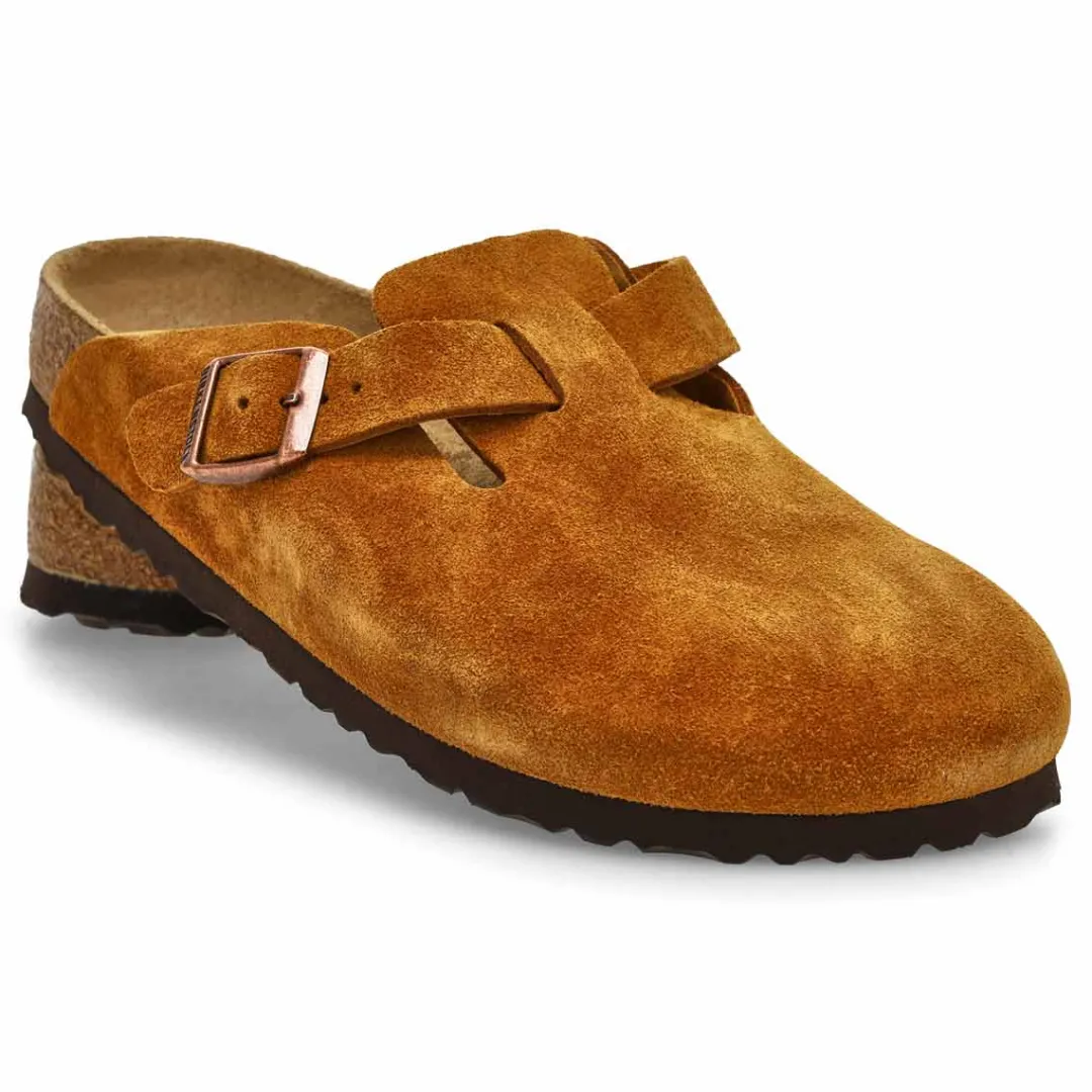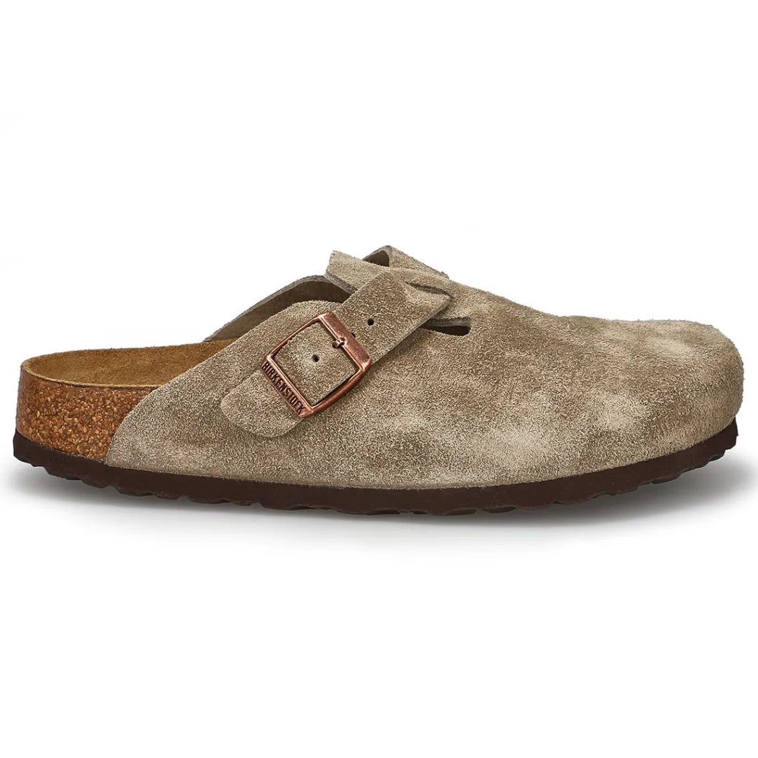 The Boston suede casual clog from Birkenstock with a soft cushioned footbed provides excellent arch support. Durable EVA outsole, cork footbed molds to each individual foot to provide a custom fit. This Birkenstock sandal is a genuine classic, emphasizing the handcrafted and natural look of stylish sandals. A comfort legend and a fashion staple.