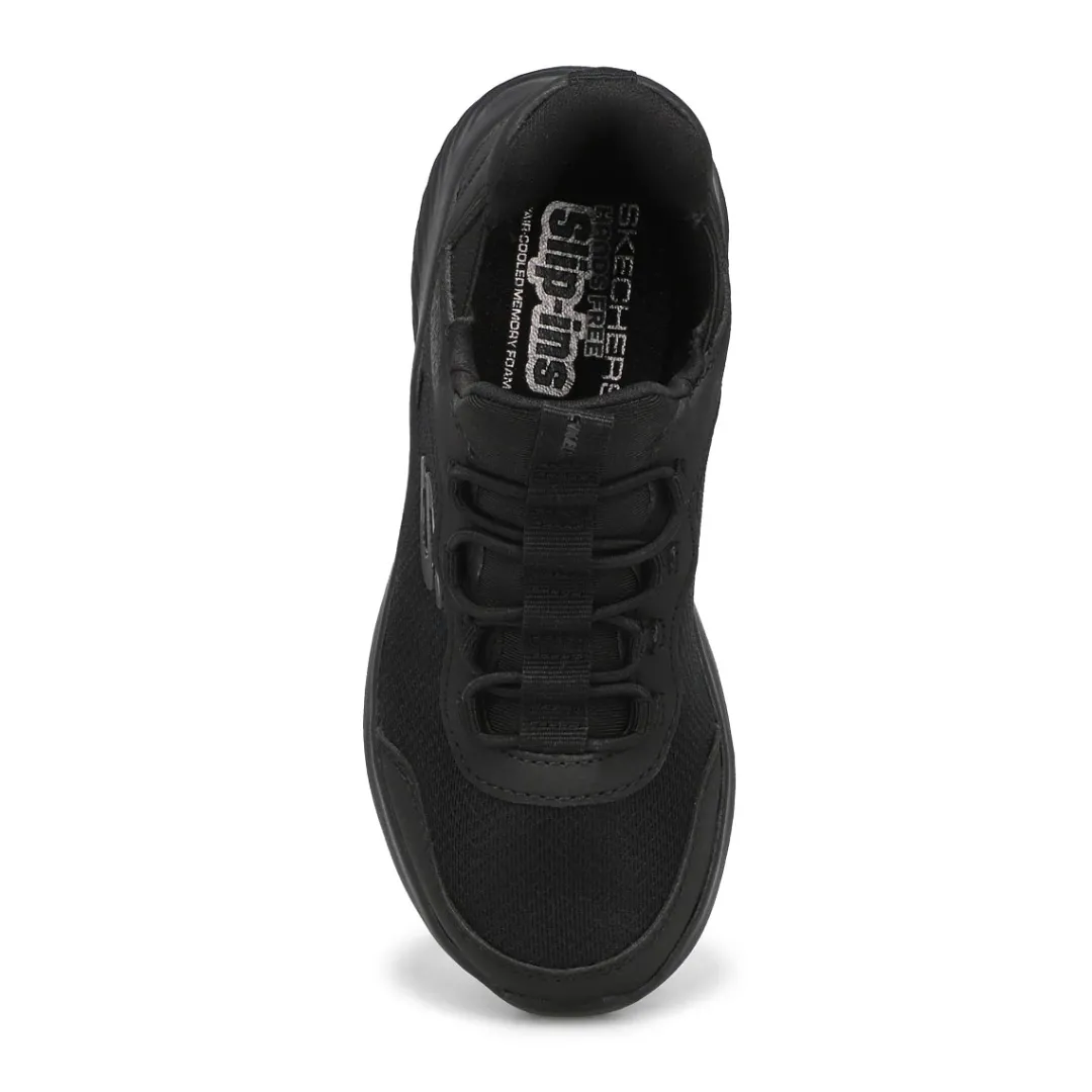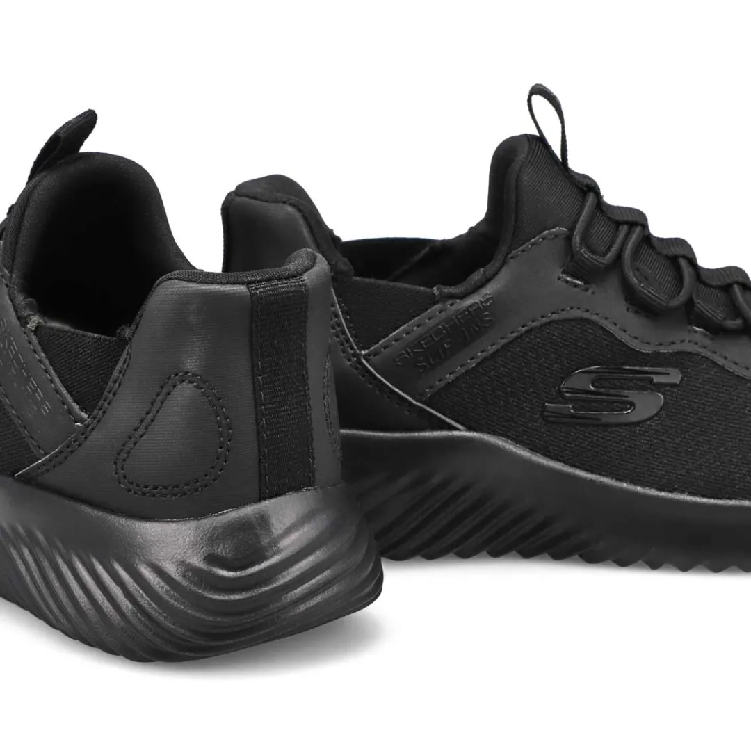 Effortless comfort comes with Skechers Hands Free Slip-ins Bounder Bris-Burst black /black sneaker. Designed with Skechers exclusive Heel Pillow, this slip-on style features a mesh and synthetic upper with stretch laces, Skechers Adaptive Closure for a customized fit. A cushioned Skechers Air-Cooled Memory Foam insole. Flexible traction outsole with a 1 1/4-inch heel height.