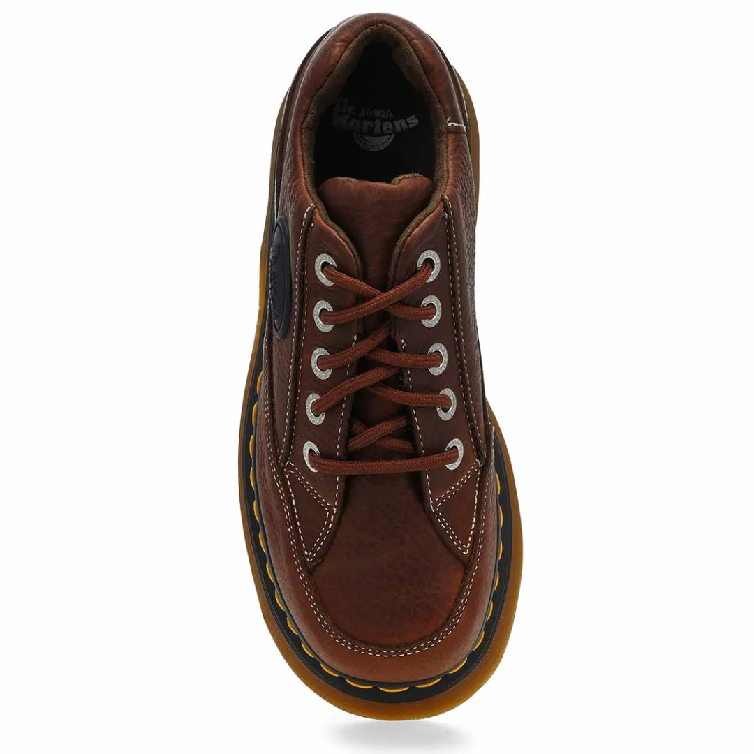 Feel the Buzz. Inspired by Dr. Martens’ 90s silhouettes, the new Buzz 5-eye shoe grabs attention from top to bottom. It stands on their chunky barrel-edge Buzz sole — marked with DM’s grooving, yellow welt stitching, and a leaf pattern on the undersole. The soft Grizzly leather upper has a comfortable padded collar, contrast stitch detailing, and an inflated, rubberised badge that echoes the contours of the sole.