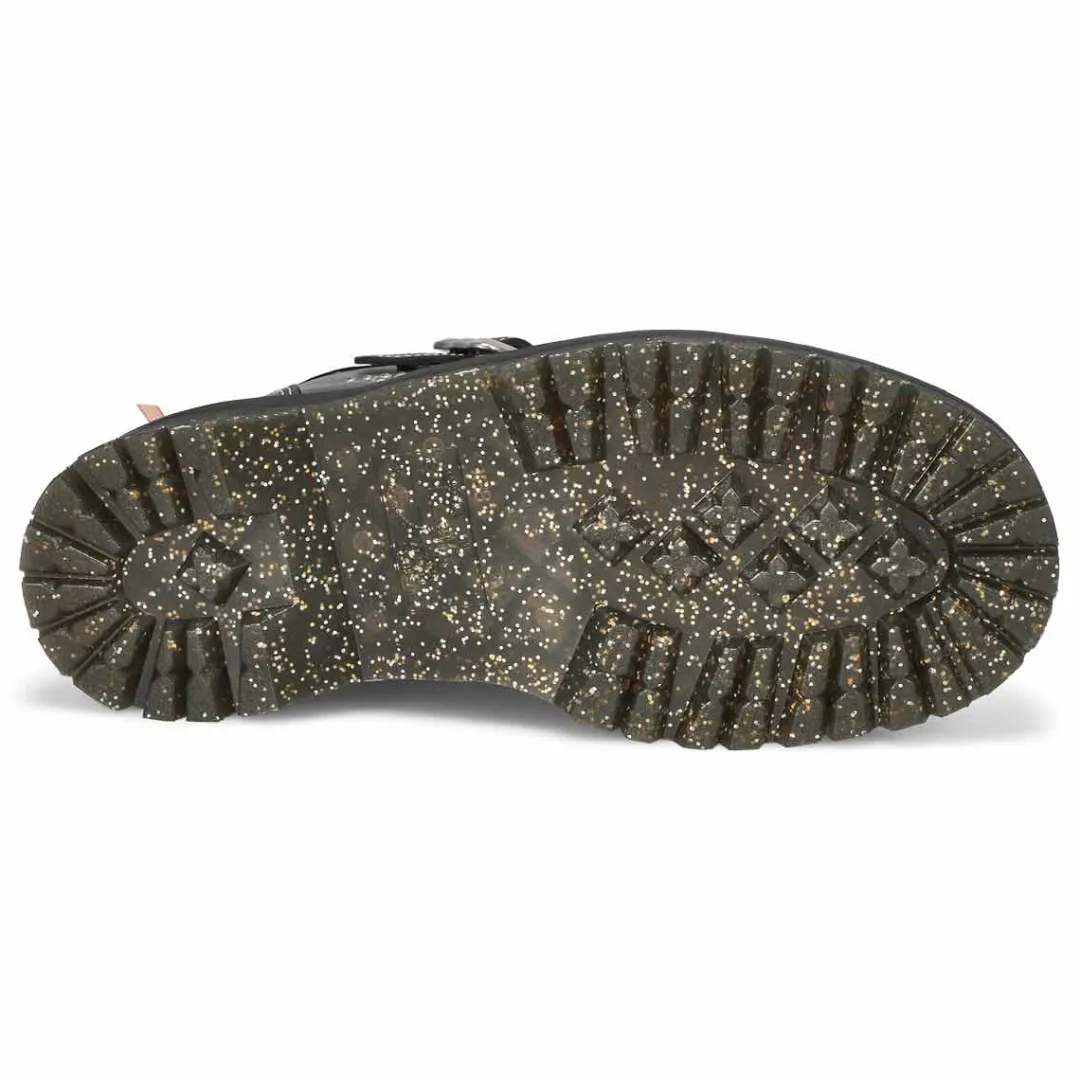 A customisation mashup. The Caitie black/ powder pink ankle boot from Dr. Martens is covered heel to toe with playful details and bursts of colour. A shiny silver buckle, Dr. Martens branded charm, velvet ribbons, embroidery, and diamante detailing. With padding around the ankle and a statement pink tongue. The platform Quad sole is infused with glitter, secured with powder pink welt stitching, and detailed with a powder pink scalloped rand.