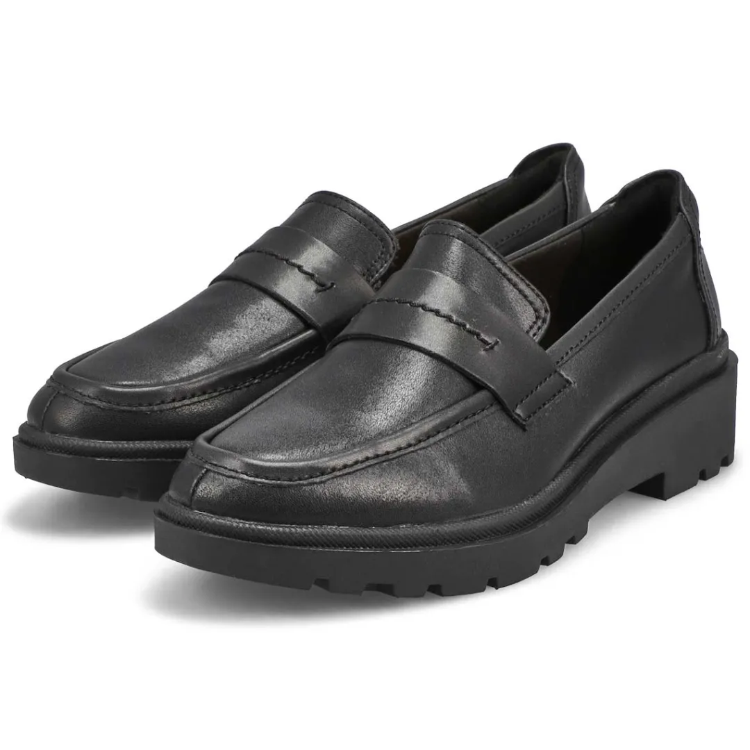 From work to weekend, our Calla Ease loafer from Clarks gives you comfy steps all day long. With an on-trend lug sole and black leather uppers, its chunky profile is still light as a cloud, thanks to a flexible EVA sole and plush underfoot cushioning. With its soft textile sock and upper lining, enjoy fresh feet with feel-good style credentials.