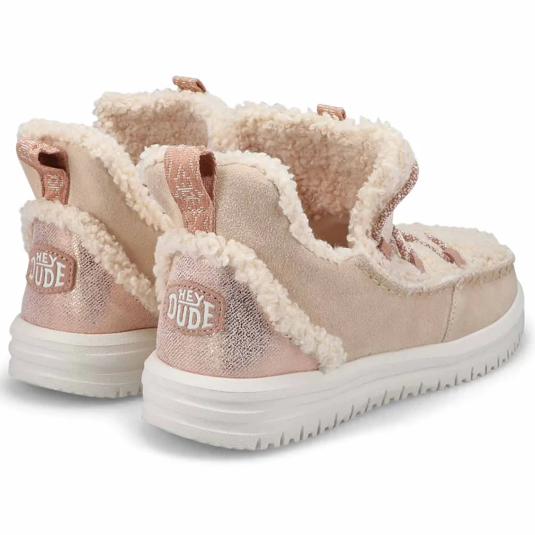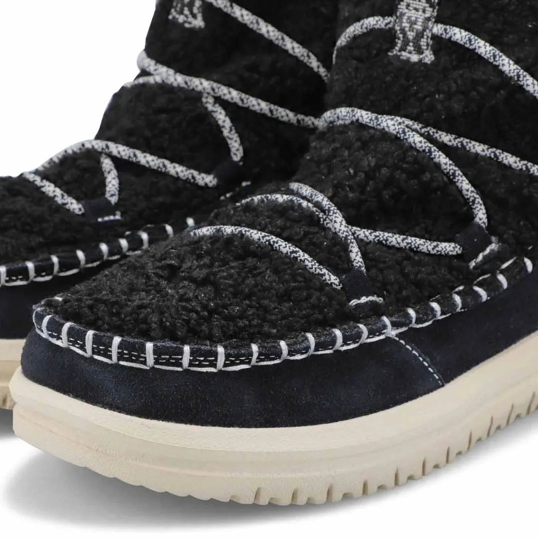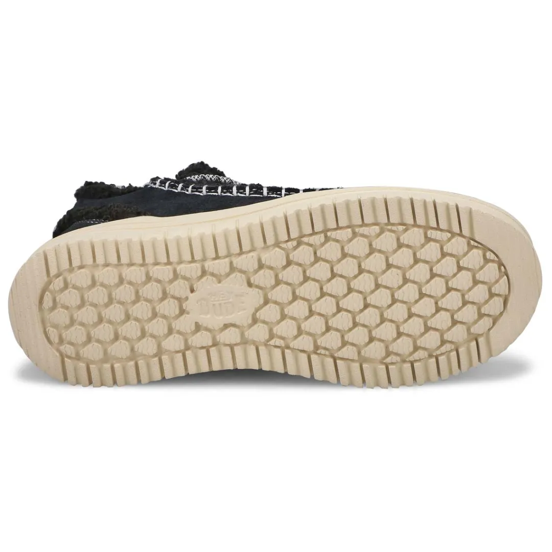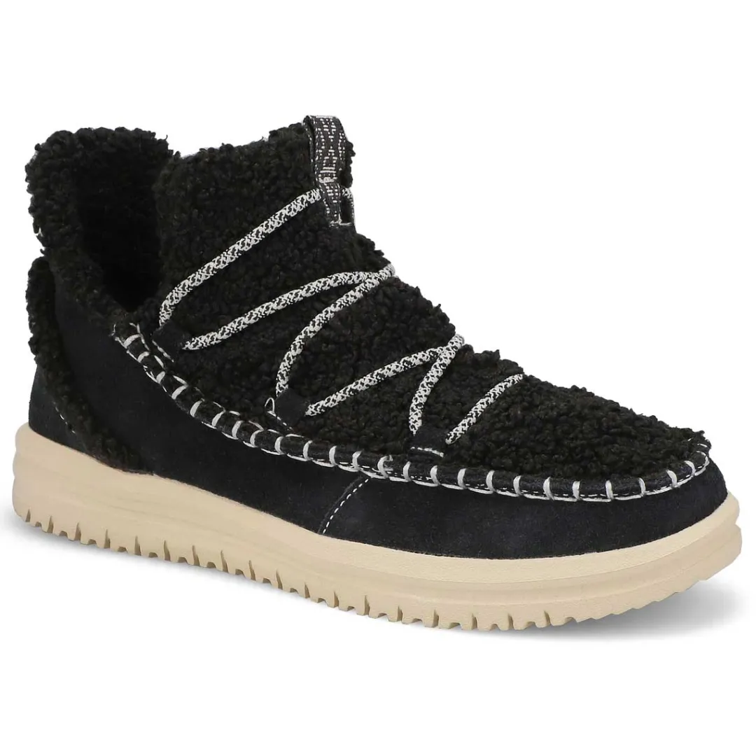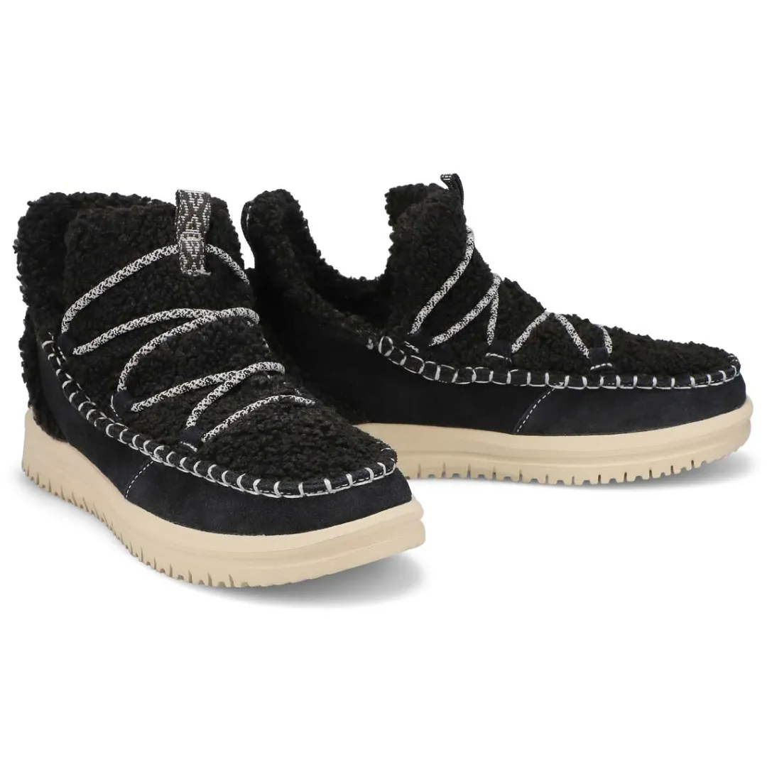Camden just got cozier with the Camden Suede Cozy black slip on ankle boot from HEYDUDE. Covetable 360 degree comfort, suede upper with a faux shearling vamp and oh-so-light flex outsole will have you walking on cloud nine. Easy on heel webbing loop with stretch lacing. We were thinking comfort and extra cute–totally delivered.