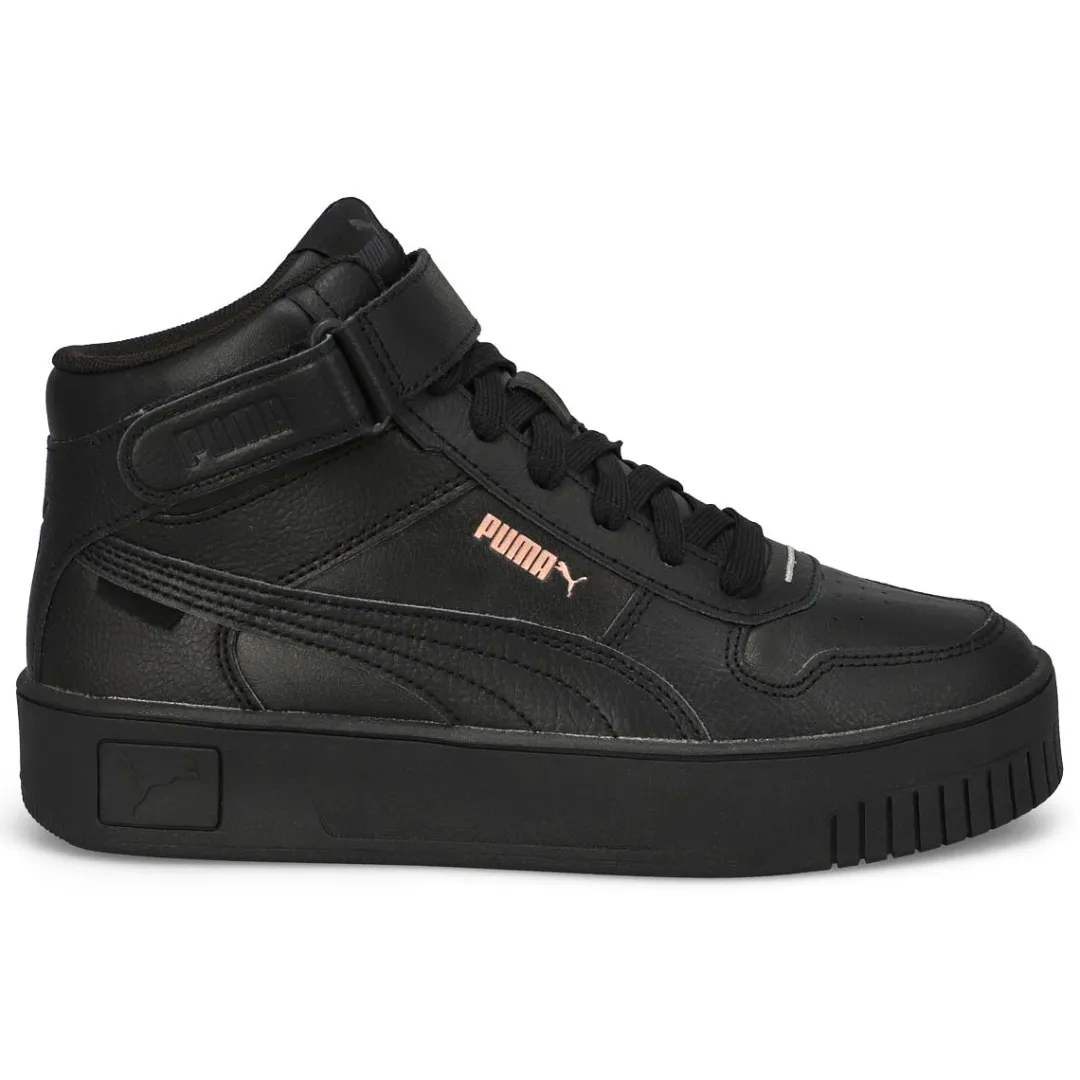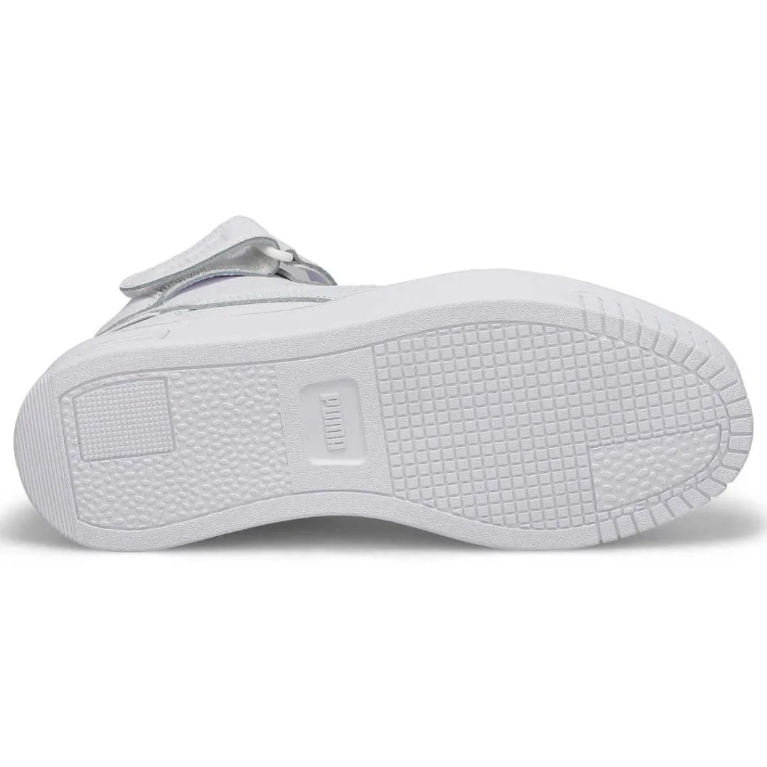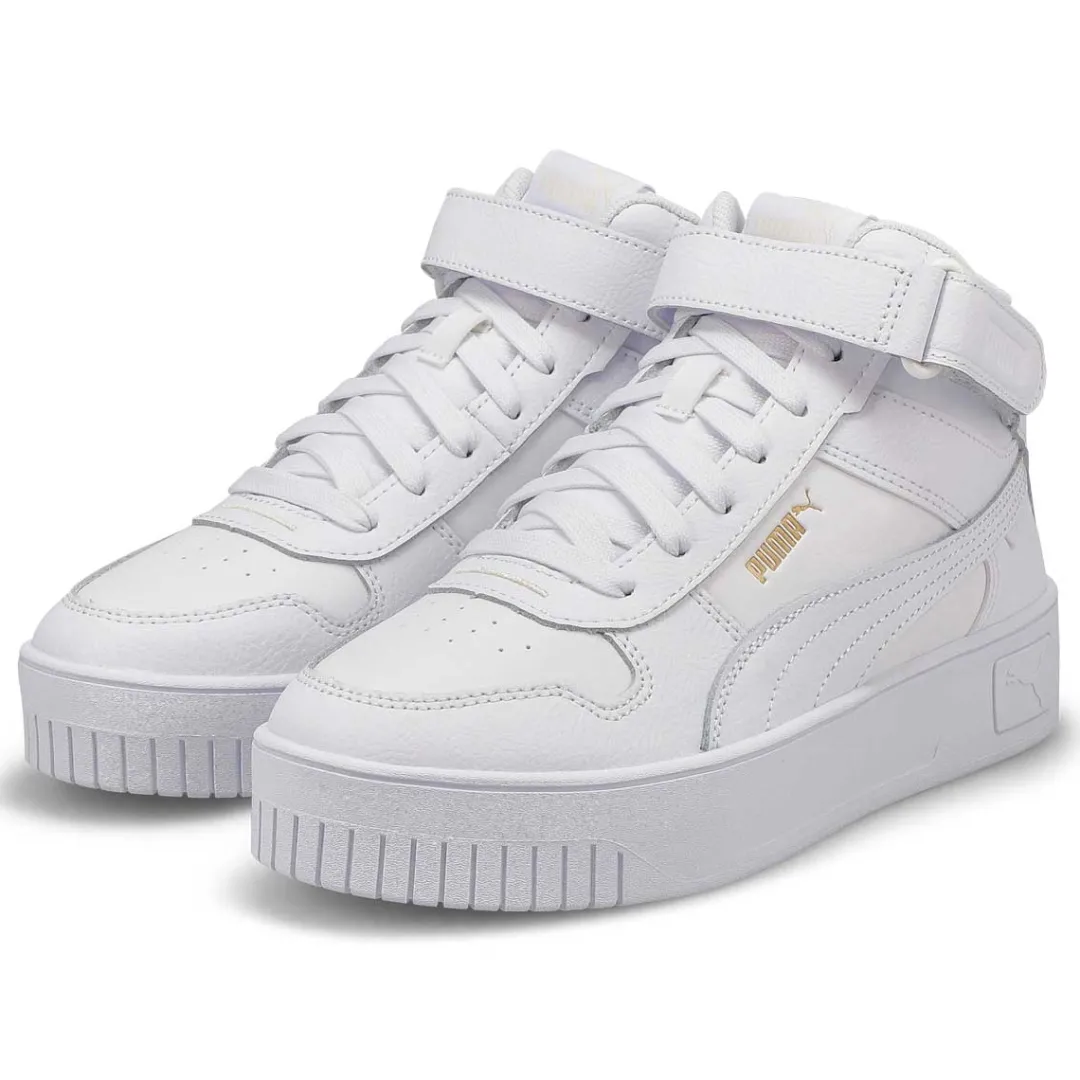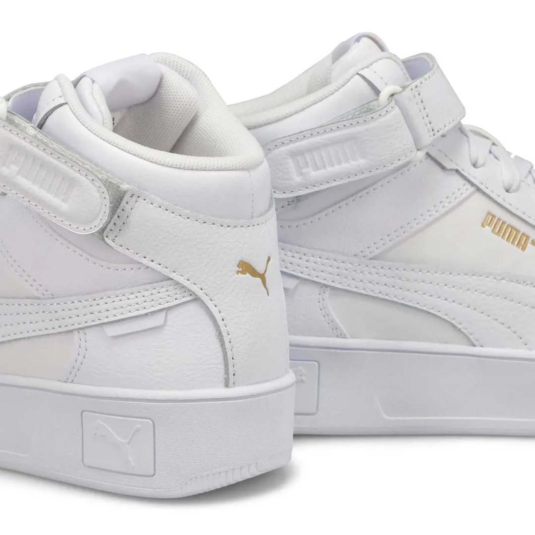 The Carina Street Mid white/ gold sneaker from Puma features a streetwear-inspired design and a slightly elevated platform, making them your perfect choice for casual, everyday outfits. Upper of this shoe is made with at least 20% recycled materials as a step toward a better future. SOFTFOAM+: Step-in comfort sockliner designed to provide soft cushioning thanks to its extra thick heel.