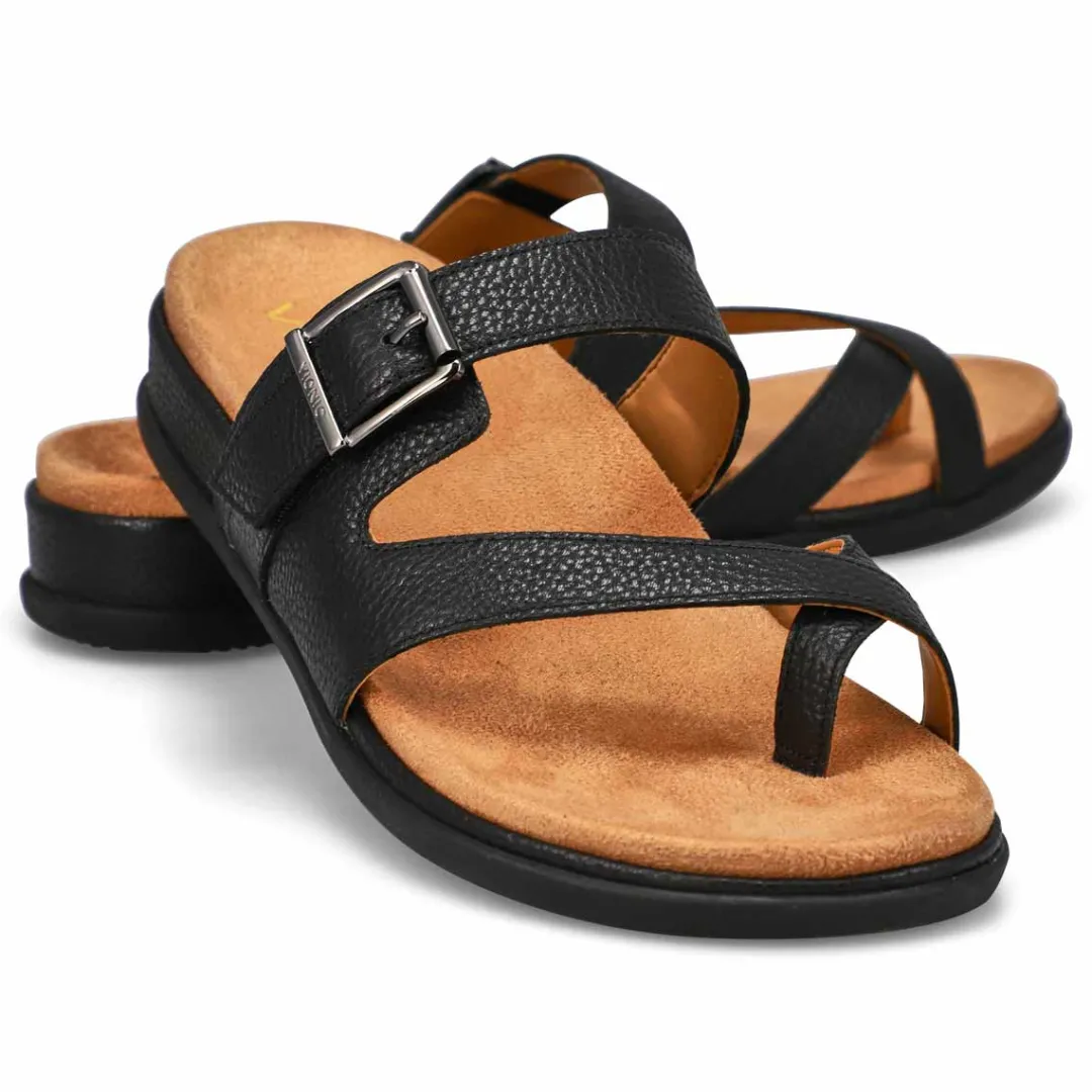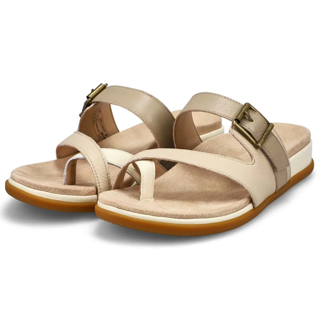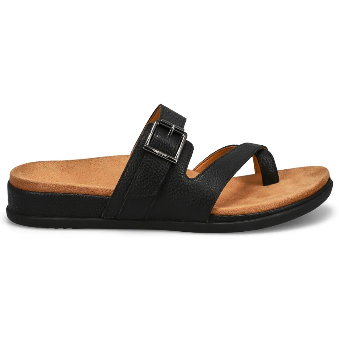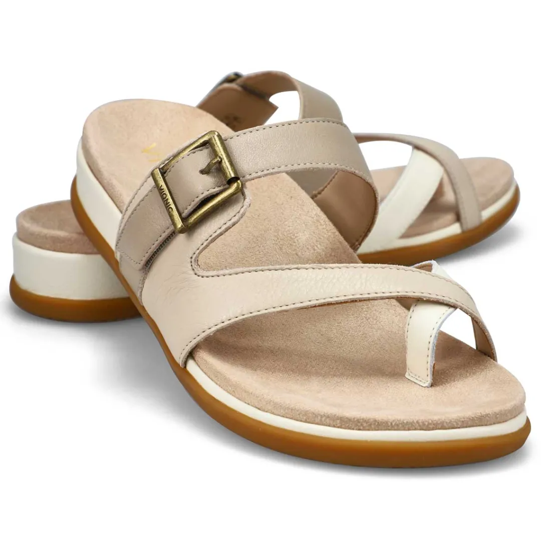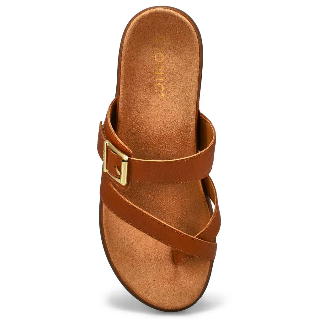 Delight in Carmela toe-post loop sandal with just enough coverage and an adjustable hook-loop strap-wrapped footbed designed for optimal comfort. Designed with exclusive alignment technology to balance the whole you. The Vionic carmela two strap casual tan sandal features a leather upper, microfiber covered EVA footbed, and a durable synthetic outsole.