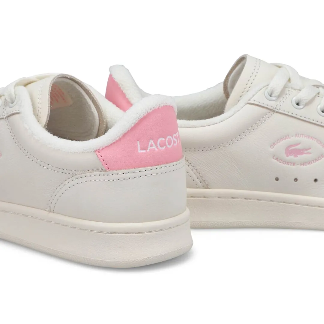 The Carnaby Set is a new, premium take on a Lacoste classic, offering the ultimate in timeless elegance. The Lacoste Carnaby Set Leather white/pink sneaker features minimal lines and a premium leather and suede upper, plus sophisticated finishing touches including a central metallic crocodile. Lining is made with 100% recycled polyester.