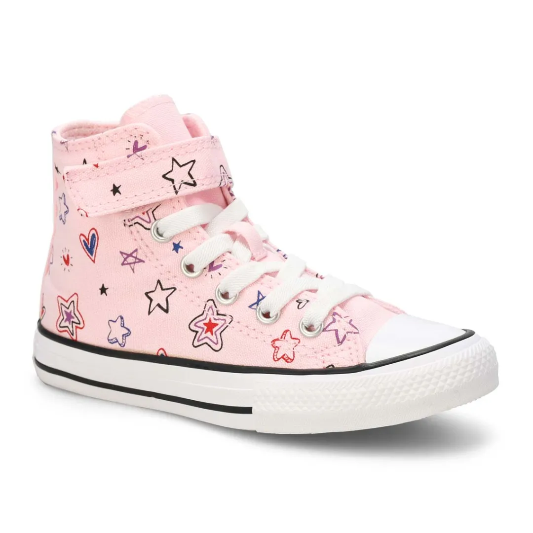 The Converse Girls’ Pre-School Chuck Taylor All Star Doodles Shoes combine classic style with playful design. The lightweight canvas upper features hand-drawn hearts and stars, inspiring creativity with every step. Soft foam cushioning offers all-day comfort, making these sneakers perfect for active little feet. Fun hand-drawn hearts and stars on the upper inspire creativity.