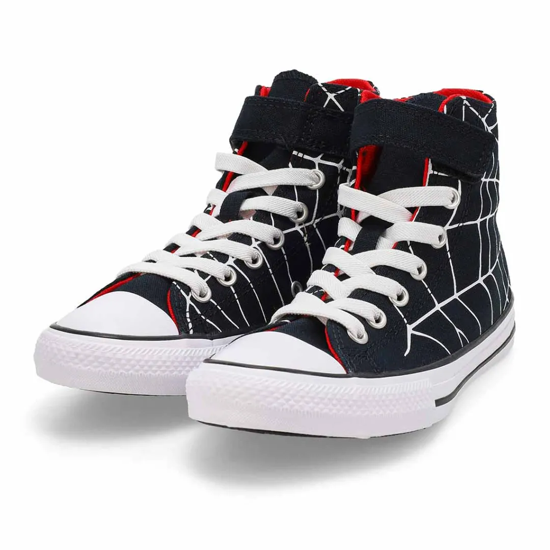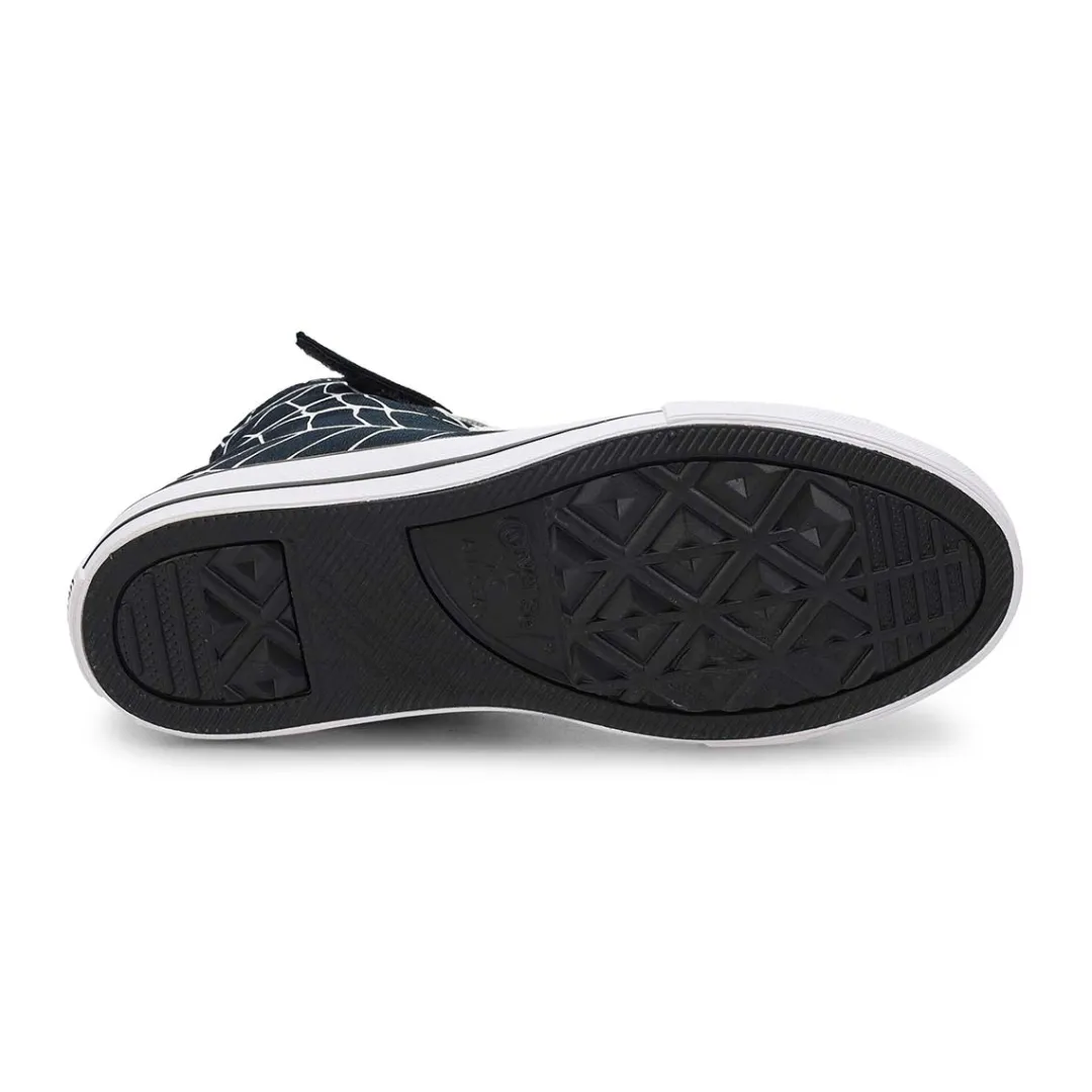 Wrap up their look with the Chuck Taylor All Star Spiderweb Black/White/Red High Top sneaker from Converse! These graphic Chucks feature breathable canvas uppers with allover spiderweb prints, signature diamond-tread soles, and a hook-and-loop strap and elastic laces for easy on and off. ll Star branding on the tongue label and license plate adds authentic style.