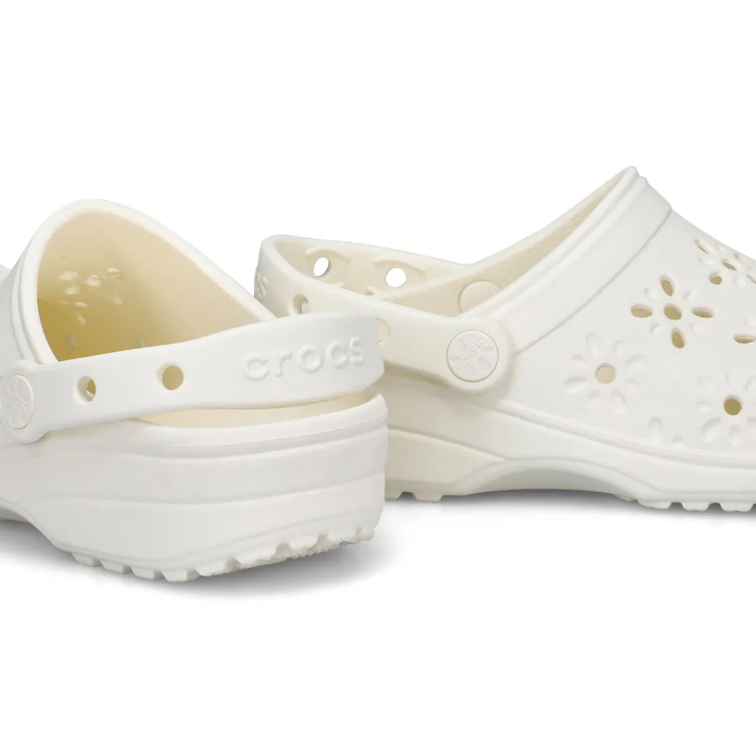 The Classic Clog with a fresh, new twist! This new evolution of Crocs clog features floral-inspired cutouts that provide a joyful, fun look, plus matching floral rivets that unify the design. You’ll still enjoy the fully-molded lightweight construction and iconic comfort of the original, and you can still add personalization with Jibbitz charms. It’s the irreverent, go-to comfort shoe that you love — now with a fun, floral update!
