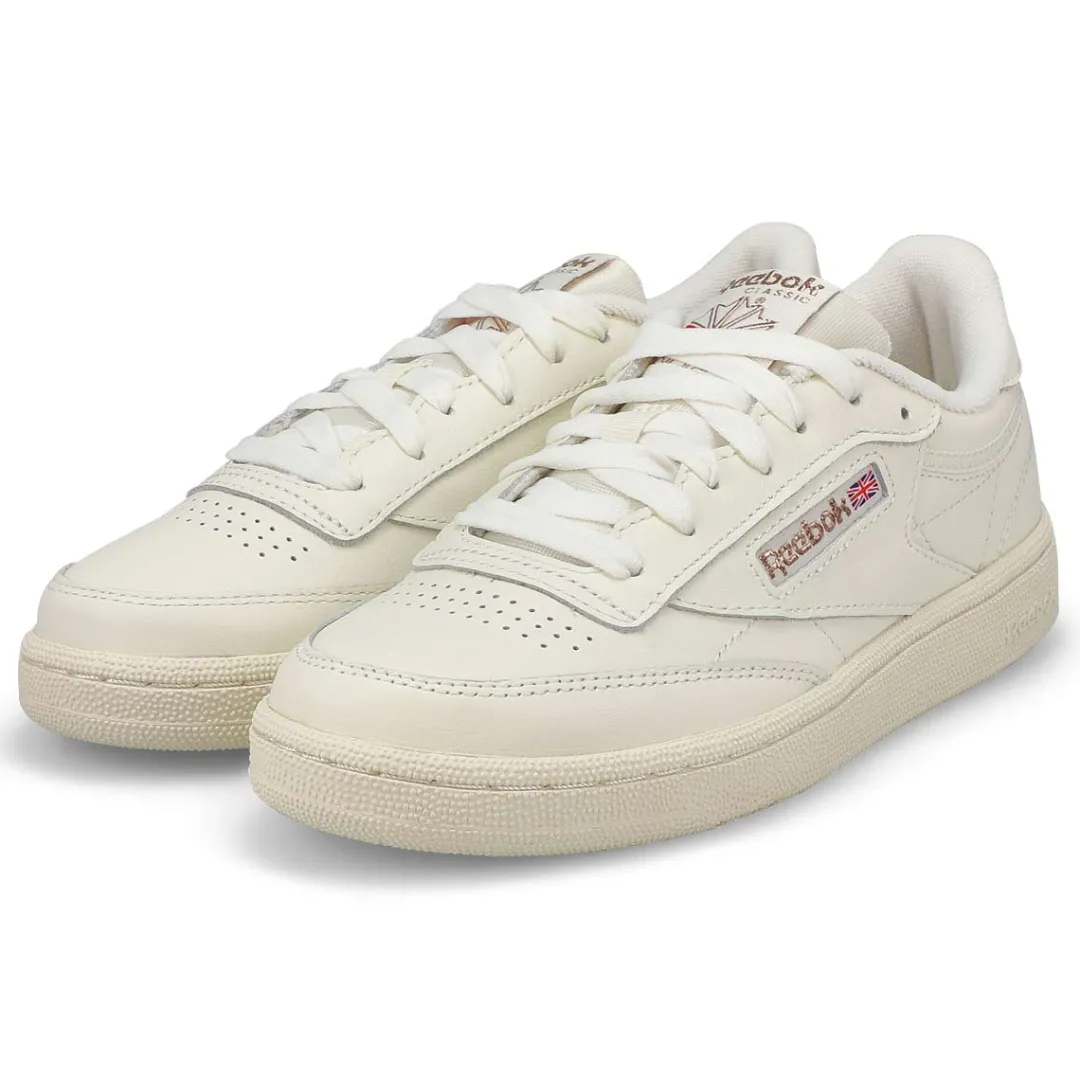 Clean, minimalist design. The Club C 85 Retro Tour Chalk/Chalk/Rose Gold tennis-inspired shoes from Reebok keeps your look sleek and simple. Pops of subtle contrast color adds a chic touch. A Reebok logo window with a Union Jack gives them old-school style. The upper is made of soft, flexible leather. There’s nothing quite like a fresh white sneaker!