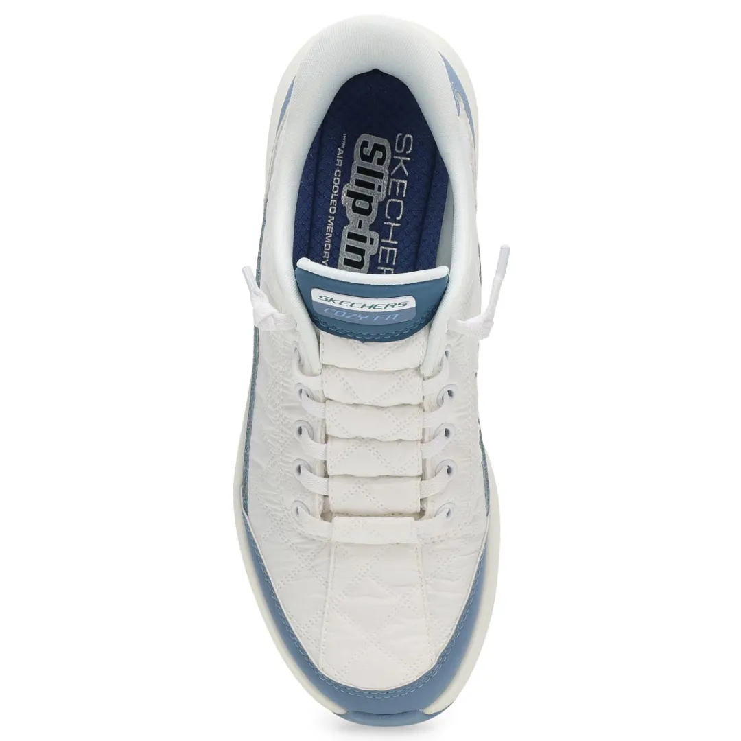 Surround your feet in effortless comfort wearing the Hands Free Slip-Ins: Contour Foam Cozy Fit Sneaker from Skechers. Designed with their Heel Pillow, this slip-on style features a quilted Cozy Fit and synthetic overlay upper with tied-off stretch laces, Contour Foam midsole cushioning, and their signature cushioned Skechers Air-Cooled Memory Foam insole.