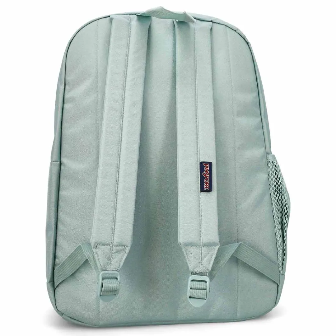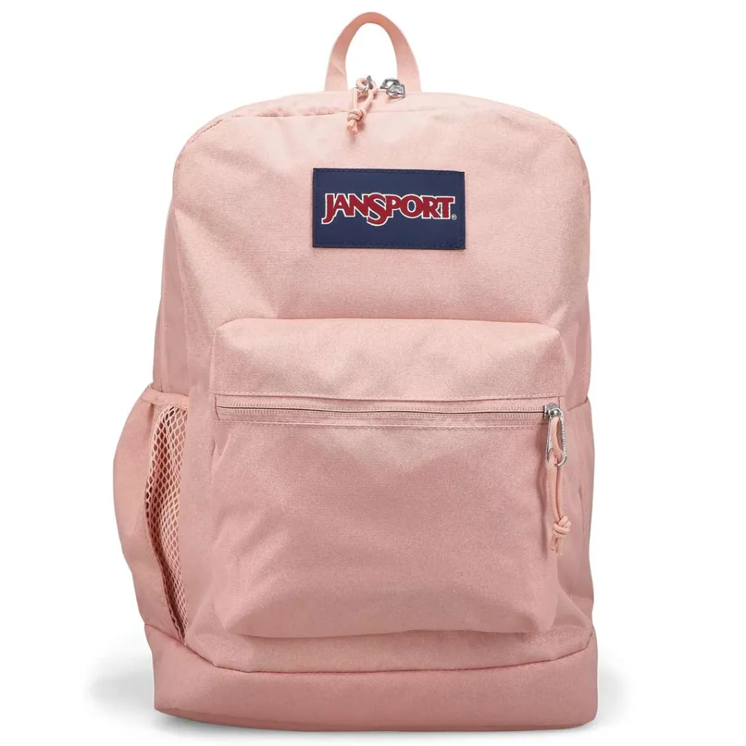 Featuring a classic silhouette, the Cross Town Plus misty pink backpacks from Jansport was designed ultralight with a side water bottle pocket for everyday use. Made from 600 Denier Polyester- Made in part with recycled materials. One large main compartment with web haul handle. Side water bottle pocket with a front utility pocket with organizer. Iconic straight-cut, padded shoulder straps. Internal padded sleeve fits 15″ laptop.