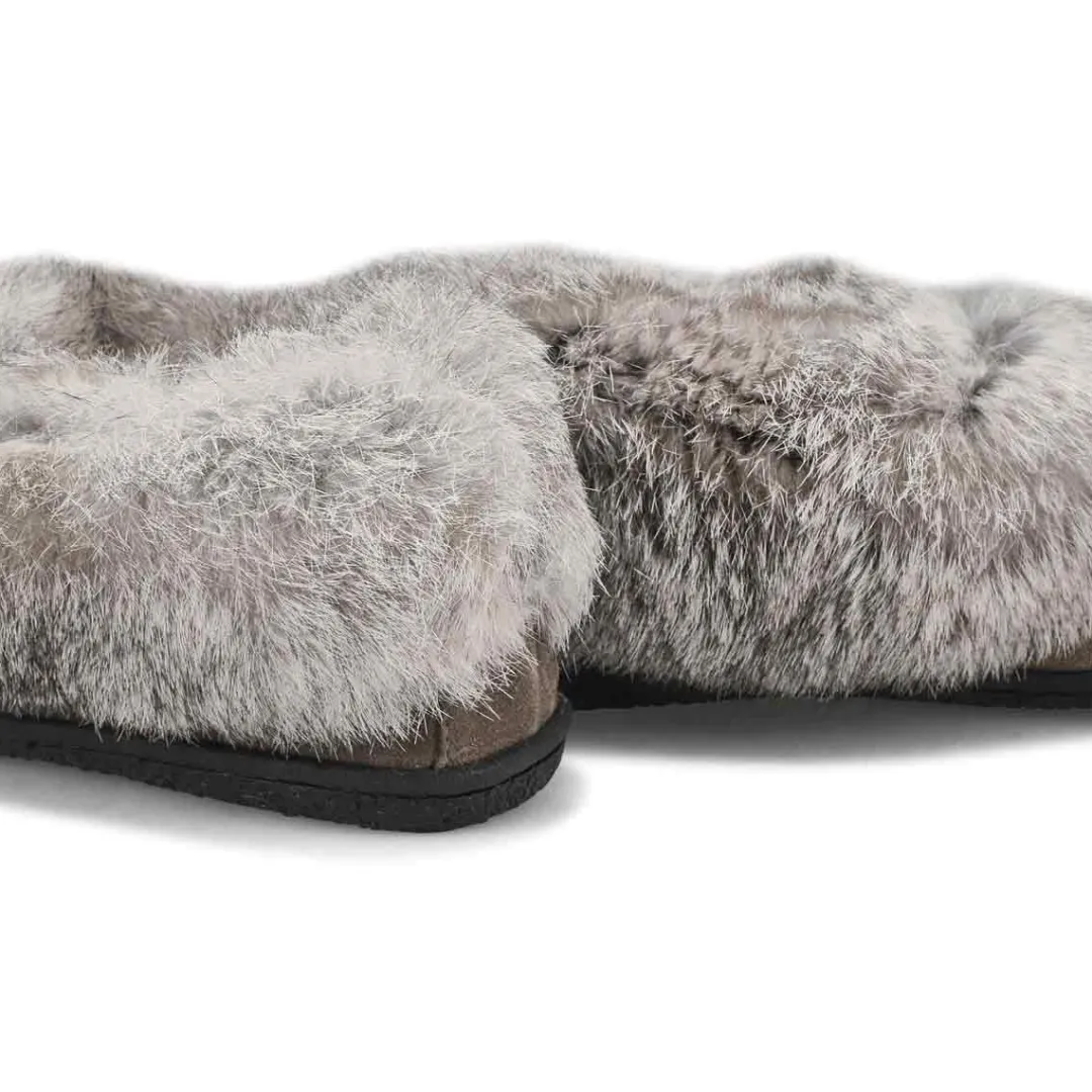 The SoftMoc Cute 5 black/ grey rabbit fur SoftMocs features a suede upper collared with genuine rabbit fur. The Cute 5 is designed with a new and inproved combination latex and memory foam insole, giving you superior rebound comfort.. New upgraded soft, plush lining surrounds the foot in comfort. The TPR outsole is great for durability. Slight dye transfer may occur during the first few wearings. Style is not made for snow or ice conditions.