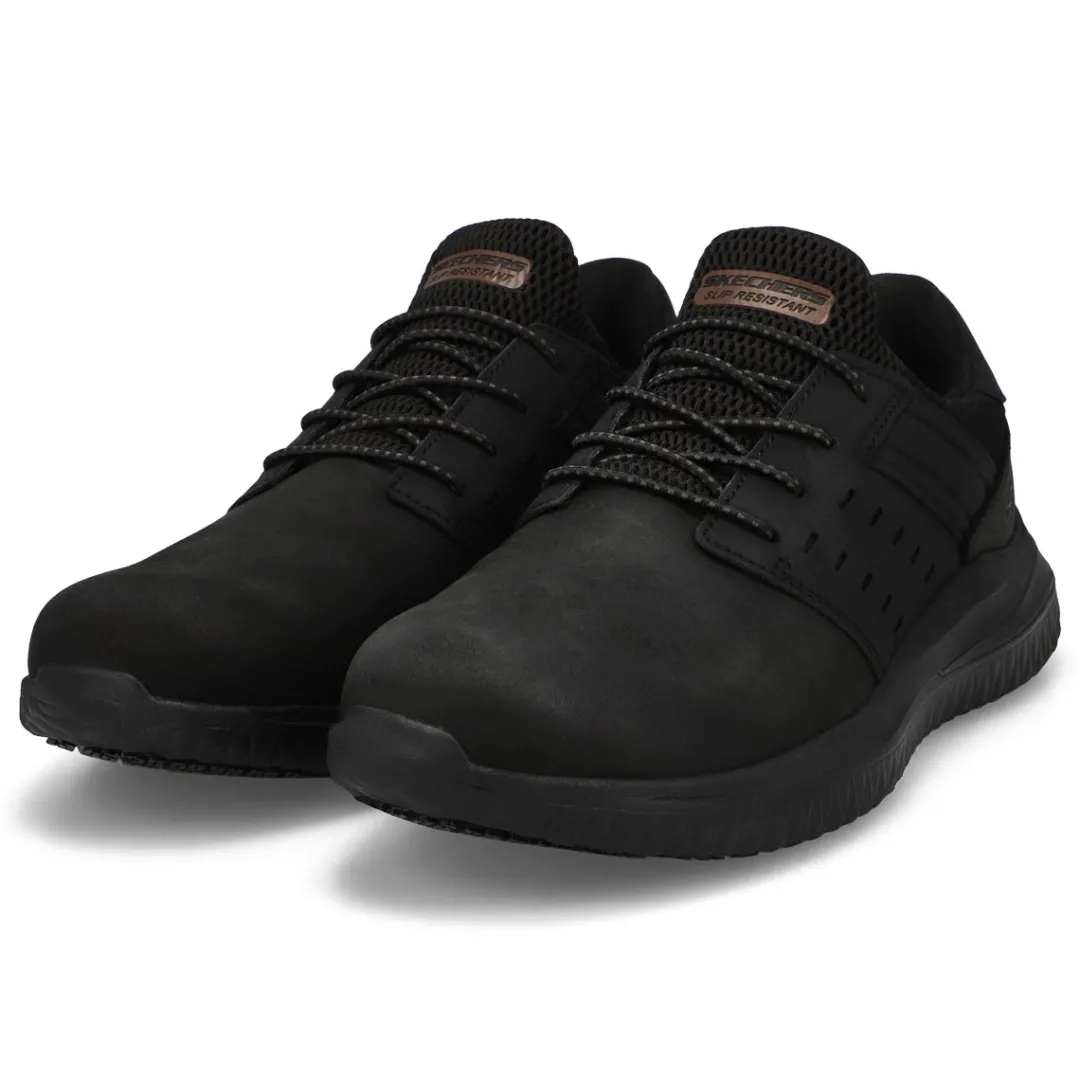 Surefooted comfort and safety gets delivered in the Skechers Work Delson 3.0 SR black slip resistant sneaker. This pull-on features a leather and synthetic upper with stretch laces, Featuring Skechers Air-Cooled Memory Foam insole. Shock-absorbing flexible midsole and rubber traction outsole. Slip-resistant outsole. Electrical Hazard (EH) safe design tested ASTM-F2892