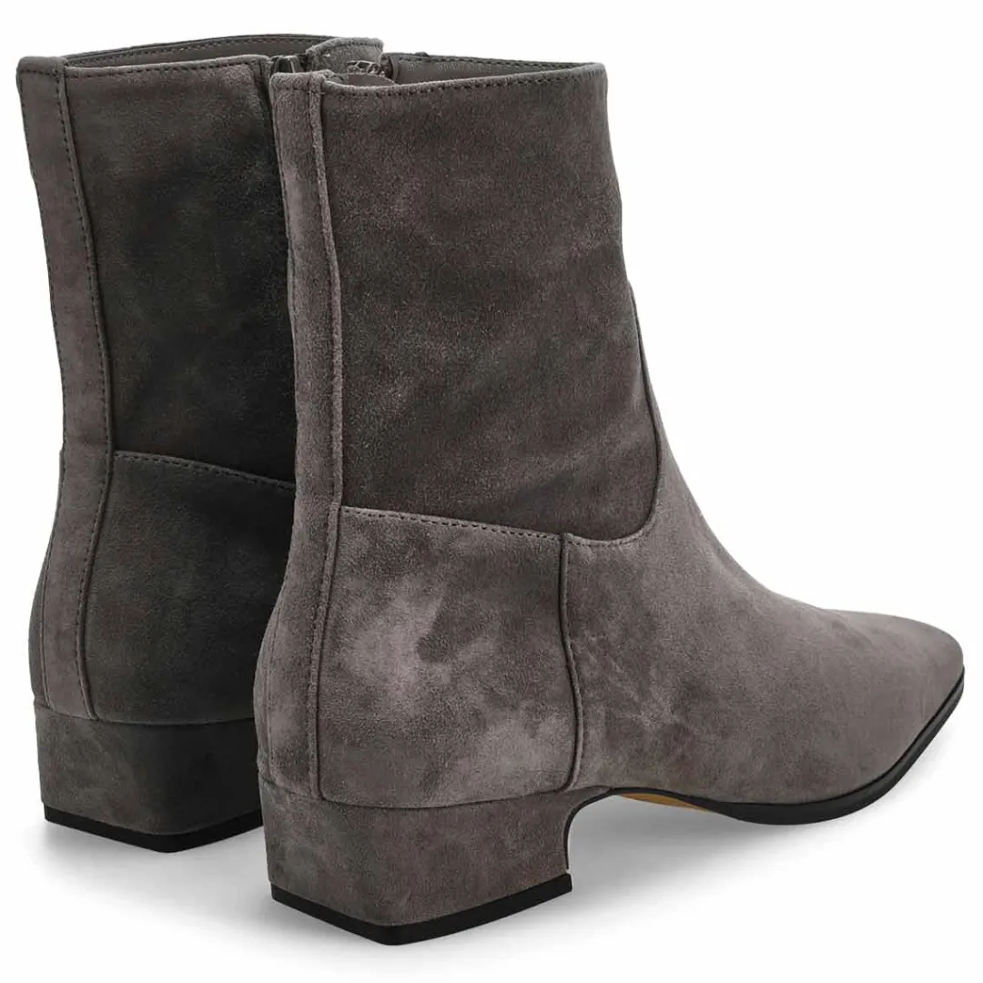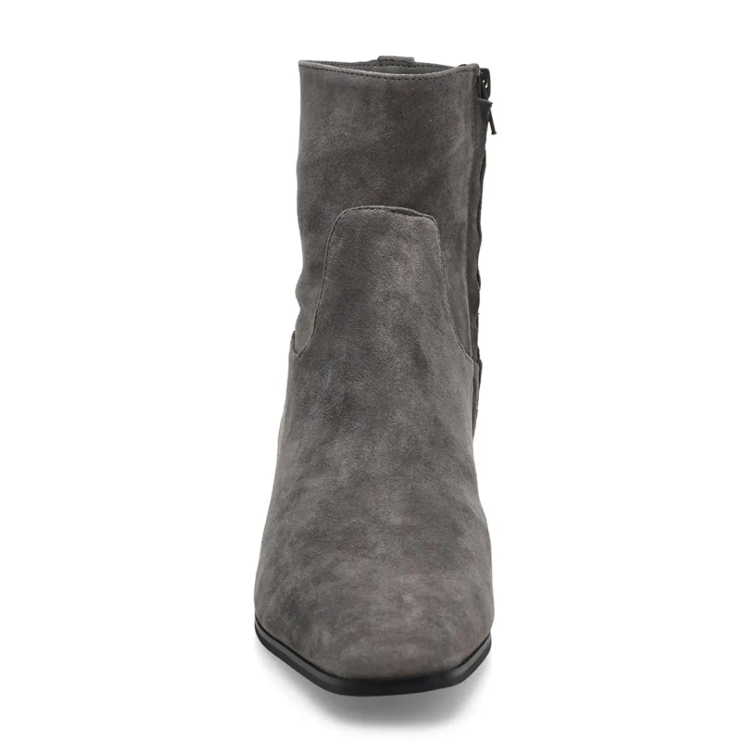 The Dusty grey ankle boot from Steve Madden offers both style and comfort with its pointed-toe design and block heel. Leather upper material with breathable textile lining. The perfect bootie for any occasion, it will elevate any outfit while providing all-day support. A must-have for any fashionable wardrobe. 1.5 inch heel height.