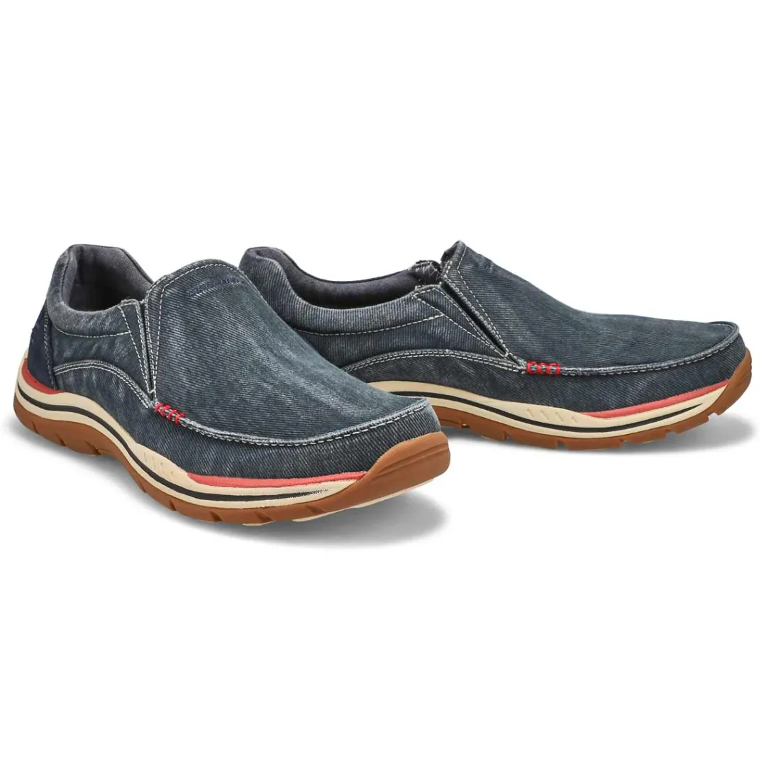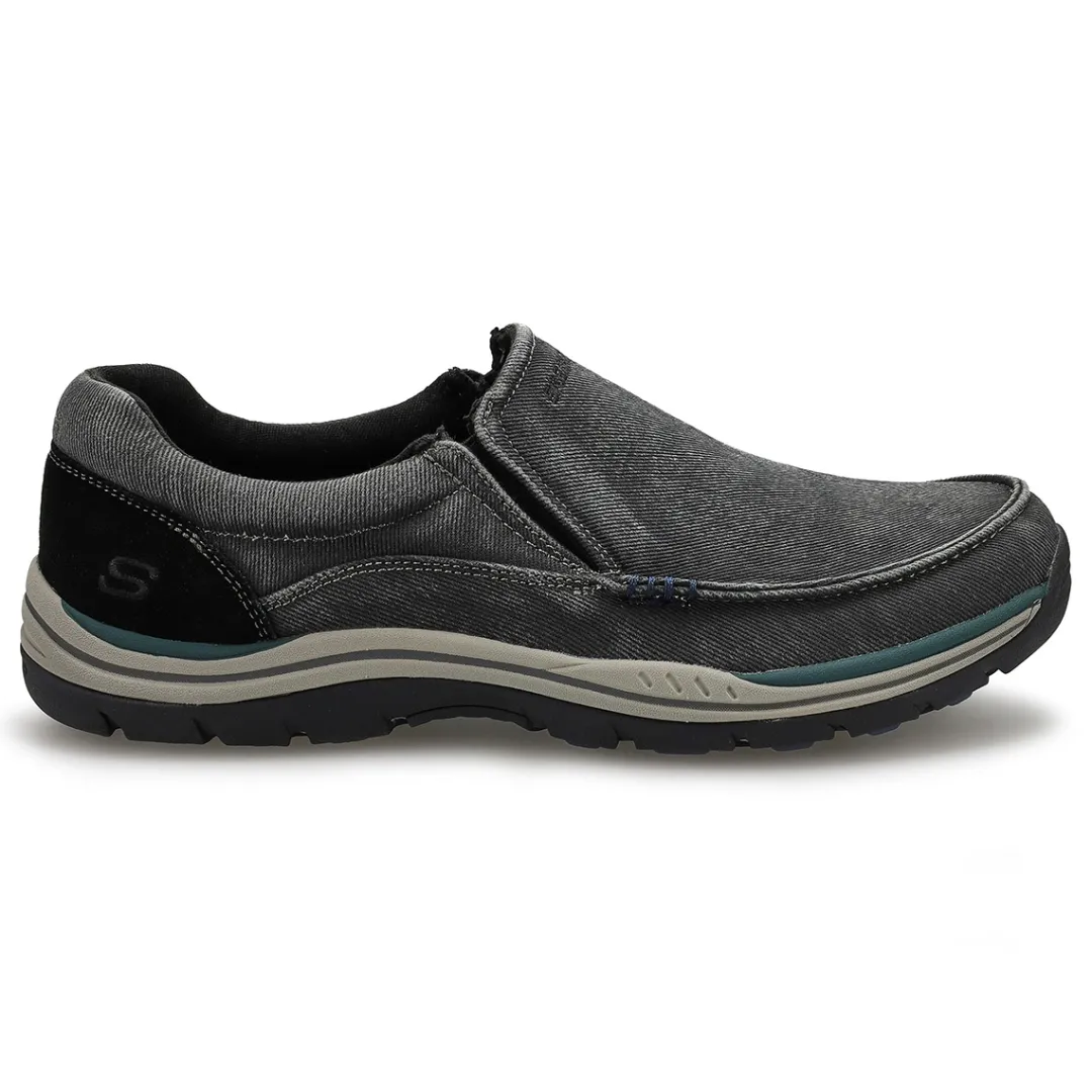 Find your island of style and comfort with the Avillo slip on black casual shoes from Skechers. Featuring a soft woven canvas fabric upper. Stitched seam moc toe front. Dual side deep elastic fabric panels with a padded collar. Slip on casual comfort loafer design. Relaxed Fit design for a roomier comfortable fit.