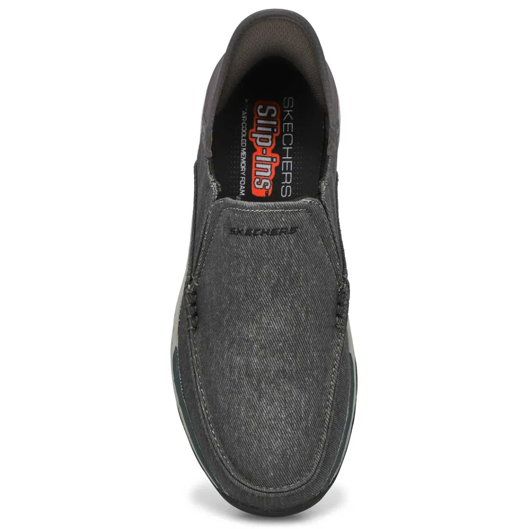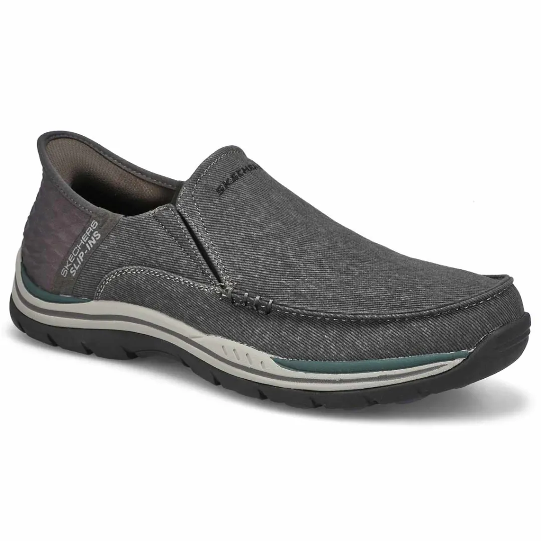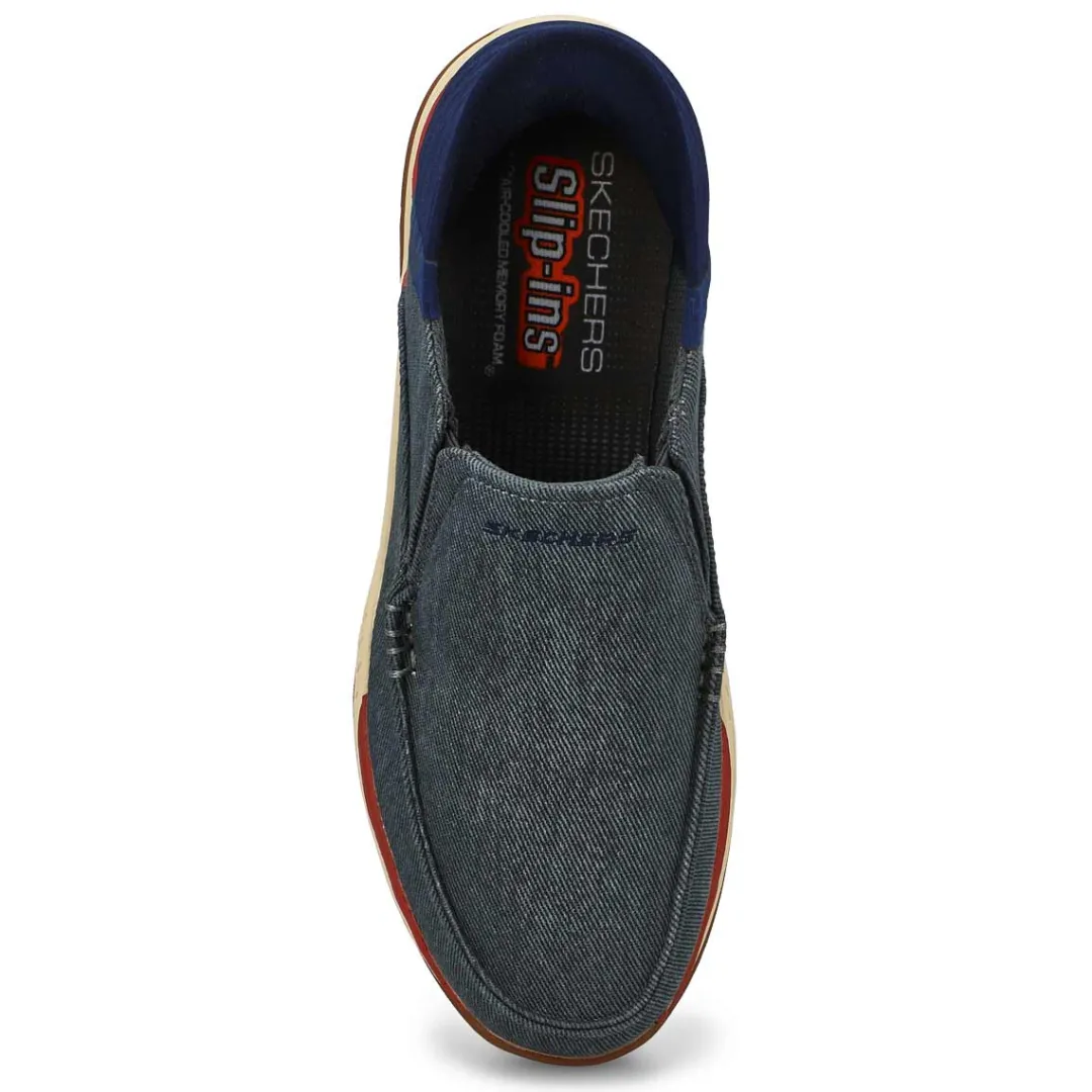 Find your island of style and comfort with the ease of the Skechers Hands Free Slip-ins Relaxed Fit Expected navy casual shoe Designed with Skechers exclusive Heel Pillow that helps hold your foot securely in place. This vegan moc toe slip-on features a canvas upper with twin gore panels, a hands-free molded heel panel, and a Skechers Air-Cooled Memory Foam insole.