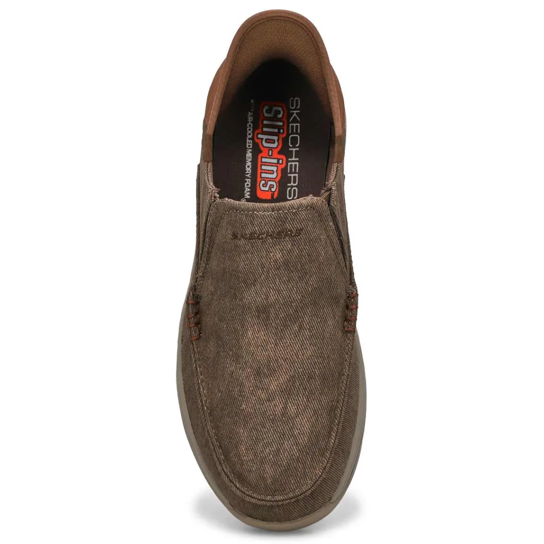 - Moc toe slip-on loafer with a canvas and synthetic upper