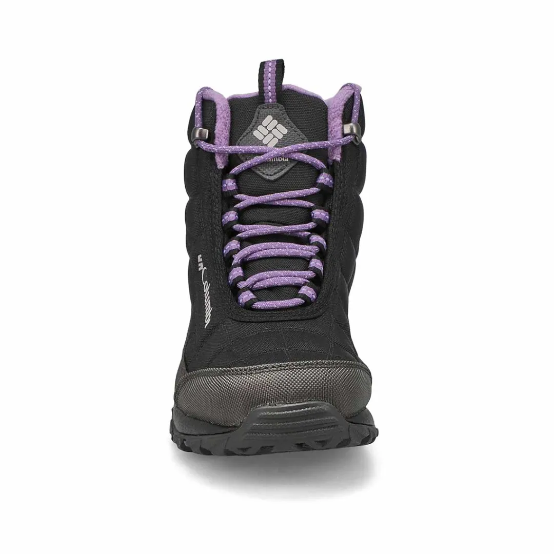 The Firecamp black/ plum purple waterproof boot from Columbia is perfect for explorers on the go! Featuring a durable textile upper with Omni-Tech waterproof breathable seam-sealed membrane bootie construction. Lace up design for a secure fit. Tech lite lightweight midsole for long lasting comfort. The Firecamp Omni Tech boot is designed with an Omni-Grip non-marking traction rubber outsole.
