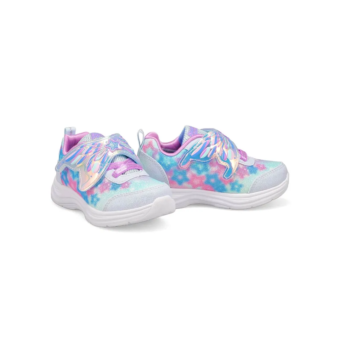 Bring on the magic and fun wearing Skechers S-Lights Glimmer Kicks Magical Wings. This light-up style features a sparkly multicolor synthetic upper with stretch laces, an iridescent synthetic ‘Magical Wings’ instep strap and a cushioned comfort insole.