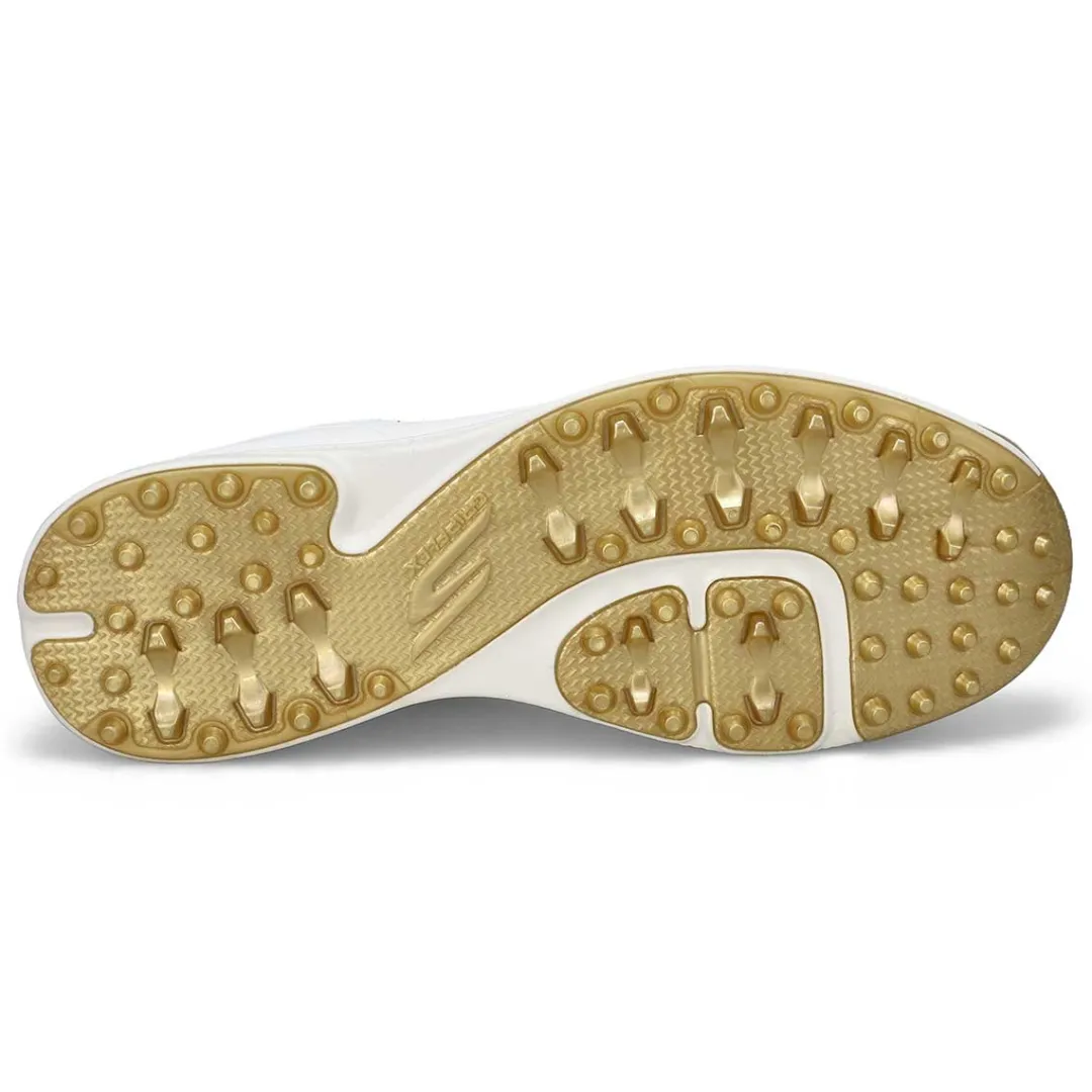 Put on your best game with Skechers GO GOLF Jasmine 2 GF white/ gold lace up golf shoe. This waterproof lace-up features a synthetic upper with a Move Foam comfort insole and earth-friendly ECO FLIGHT cushioning , plus a GRIPFLEX spikeless outsole provides superior traction and stability. Skechers GO GOLF logo detail.