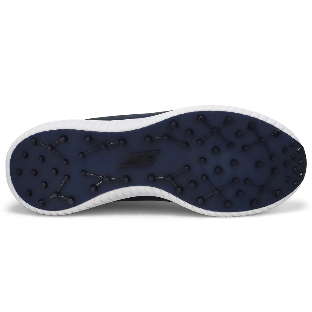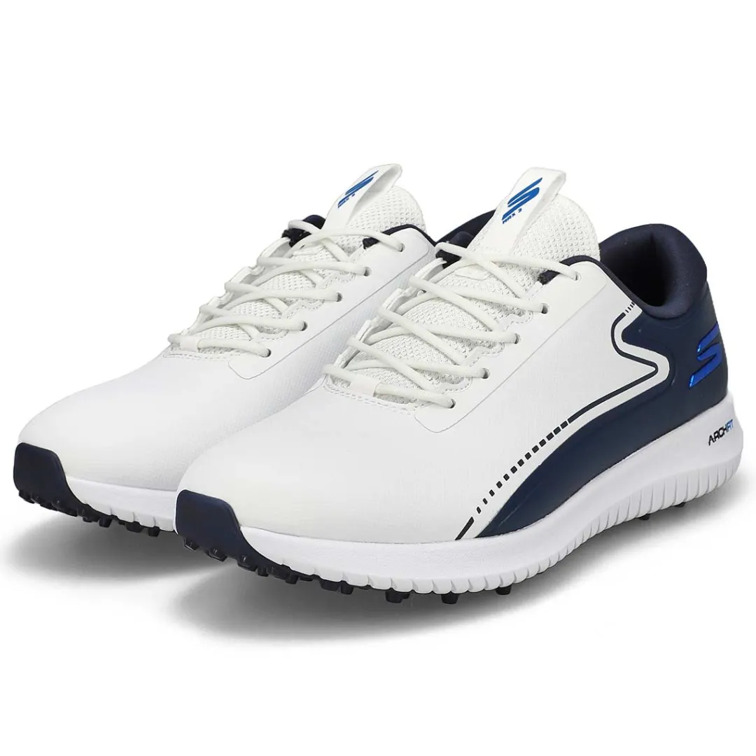 Dominate the course in all-day supportive comfort with Skechers GO GOLF Max 3 white/navy lace up shoe. This waterproof design features a lace-up synthetic leather upper with protective hotmelt overlays, removable Arch Fit insole, lightweight ULTRA FLIGHT cushioning and spikeless outsole. Removable insole helps mold to your foot to reduce shock and increase weight dispersion.
