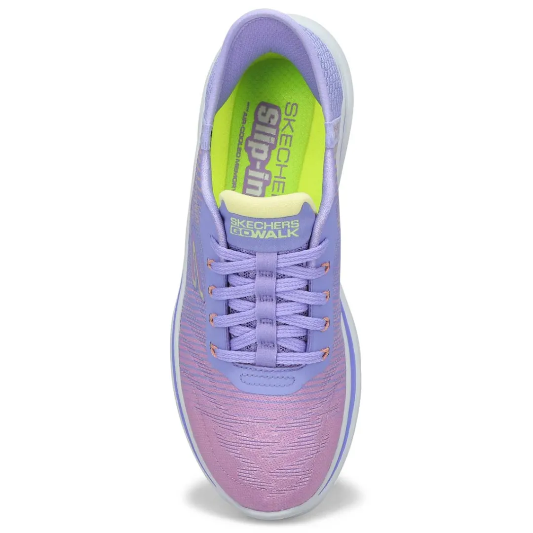 Walk in easy-wearing comfort with Skechers Hands Free Slip-ins GO WALK 7 lavender/ multi sneaker from Skechers. Designed with Skechers exclusive Heel Pillow holds your foot securely in place. This hands-free walking slip-on features an engineered mesh upper with a laced front, Skechers Air-Cooled Memory Foam insole, lightweight ULTRA GO cushioning, and high-rebound Hyper Pillars for added support.