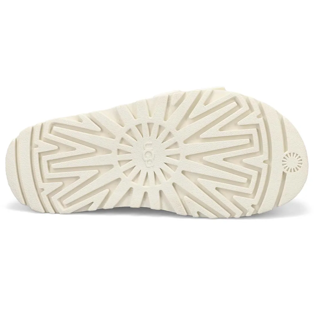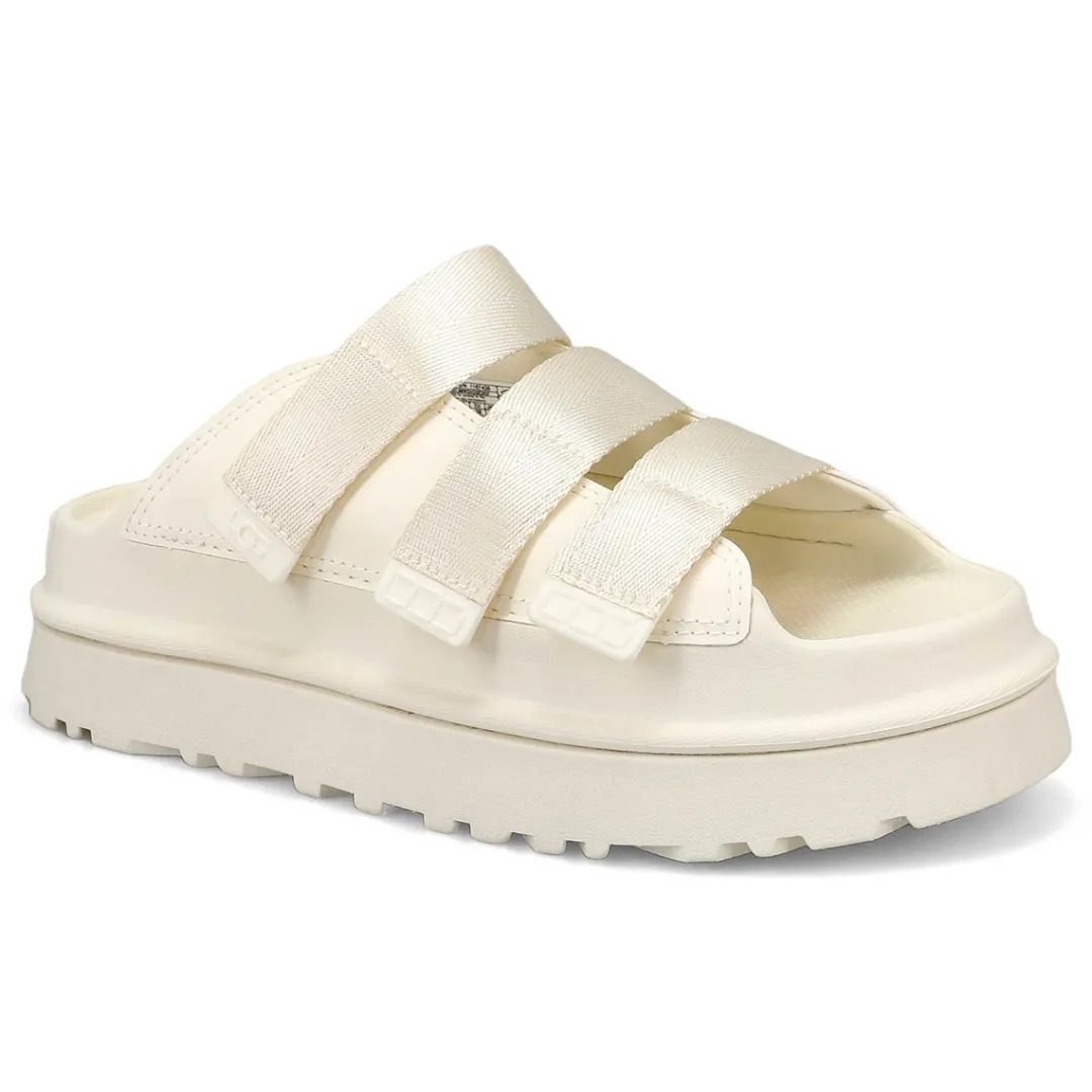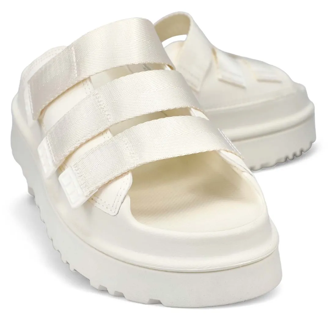 Go ahead, let yourself shine. The GoldenGlow jasmine Slide Platform Sandal from UGG is a versatile sandal with a sunny disposition. The outsole is made with super light and springy sugarcane EVA, it’s airy, easy, and bounces back. The upper features three adjustable straps made from 100% recycled fibers, so you can create the perfect fit, whether you’re rocking socks or not.