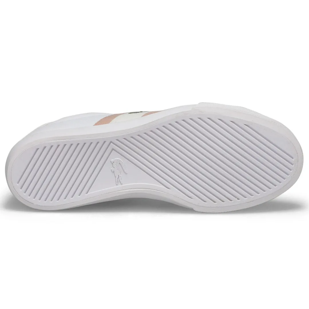 The Grad Vulc 120 1 white/ pink sneaker from LACOSTE sports a low-top design in a leather upper for a casual and stylish look! Features lace up closure for a secure fit. Brand logo hits at tongue, side and back. Round-toe construction. The Grad Vulc 120 1 sneaker is designed with a synthetic lining and lightly padded footbed for added comfort.