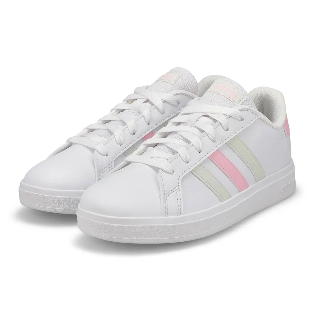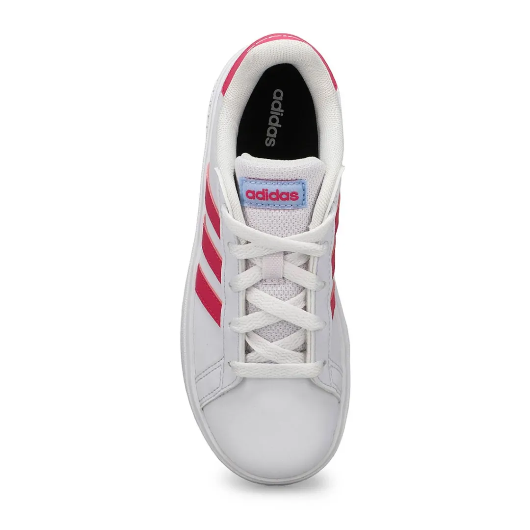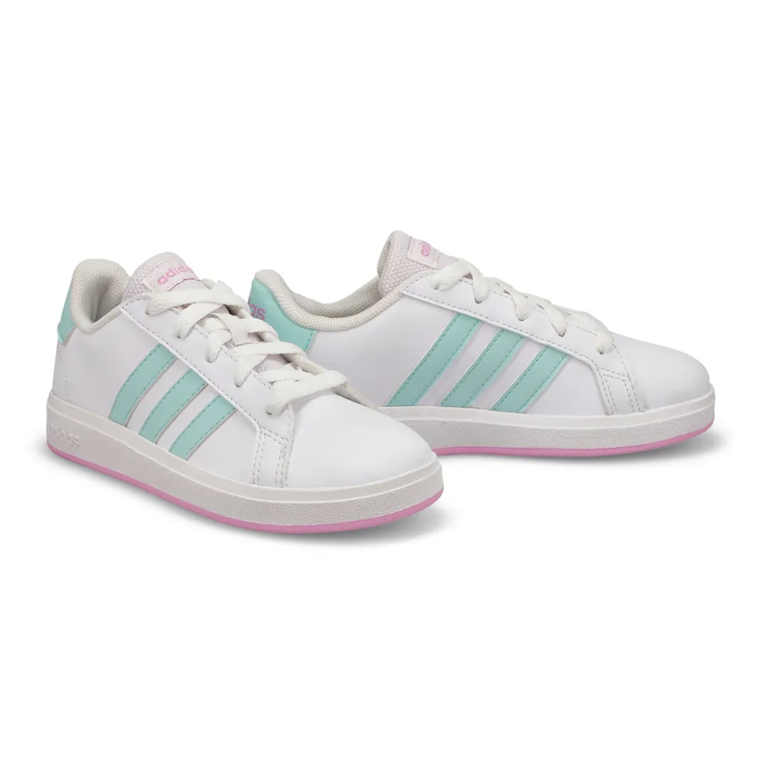 They are sure to enjoy the heritage looks and prolonging comfort of these Adidas Grand Court K white/aqua/lilic athletic shoes. Boasting a durable synthetic leather upper with signature 3-stripes, these athletic sneakers have a secure lacing system, Cloudfoam Comfort sockliner and flexible rubber sole. Your little one will stand out among the crowd!