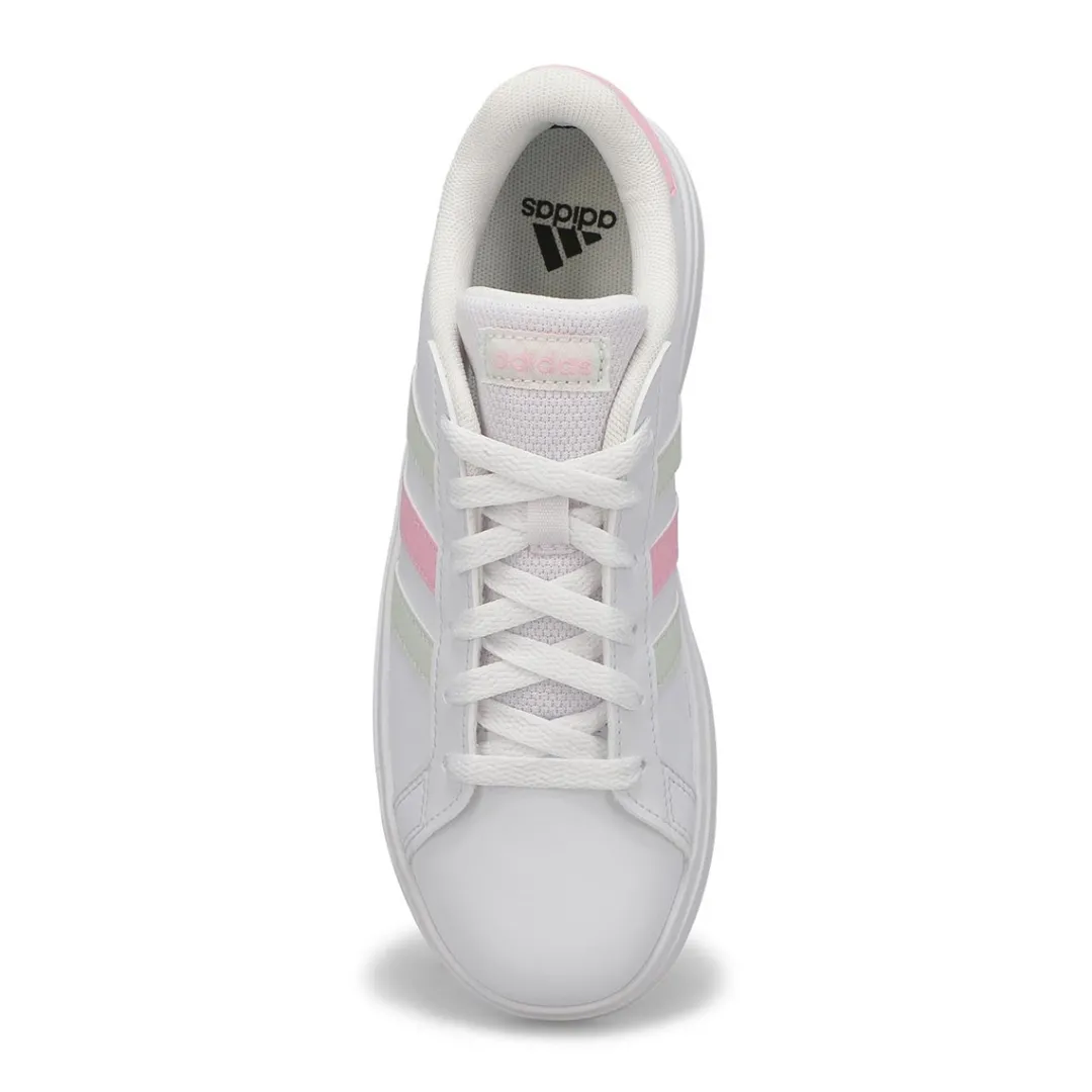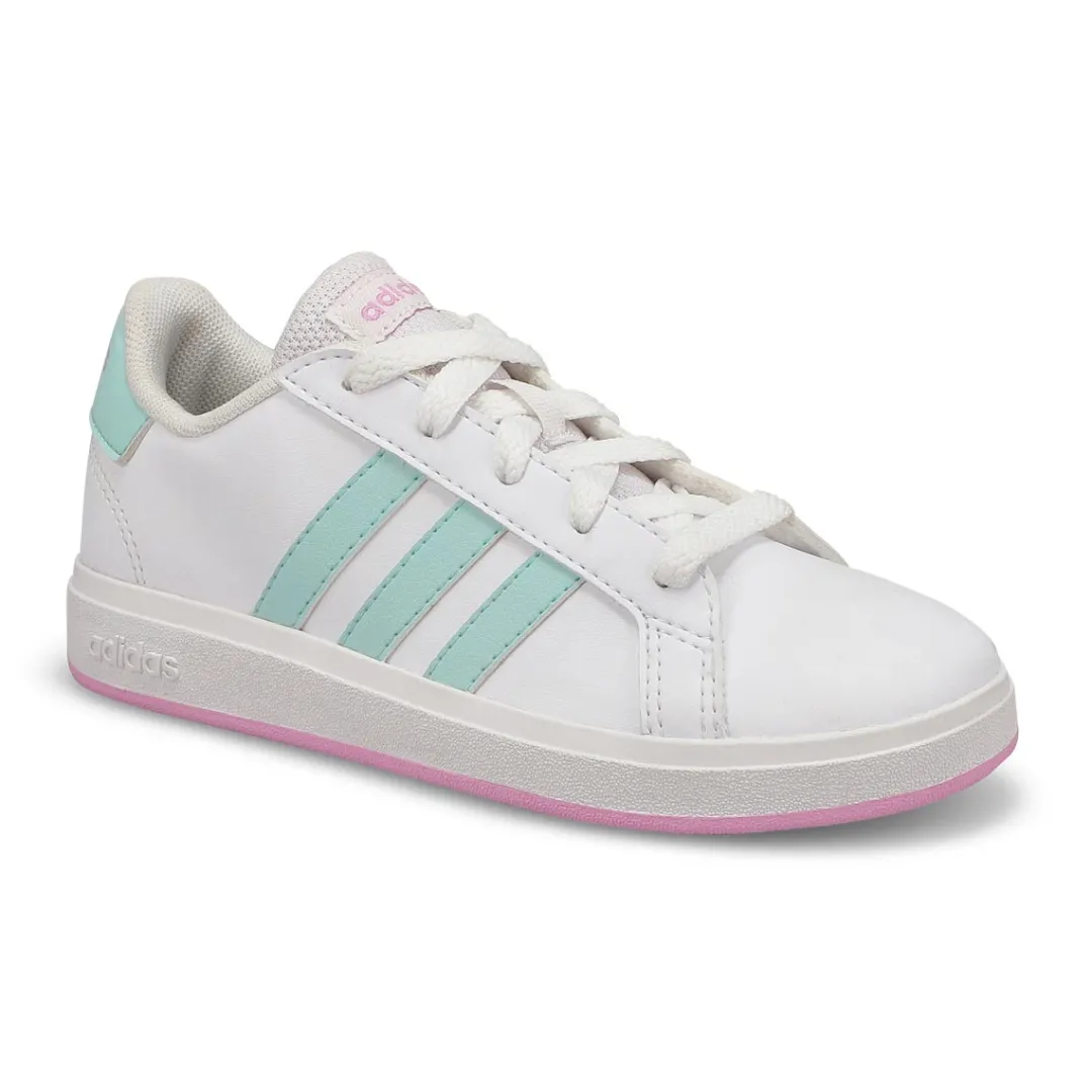 She is sure to enjoy the heritage looks and prolonging comfort of these girl’s Adidas Grand Court K white/pink athletic shoes. Boasting of a durable synthetic leather upper with signature 3-stripes, these athletic sneakers have a secure lacing system, Cloudfoam Comfort sockliner and flexible rubber sole. Your little one will stand out among the crowd!