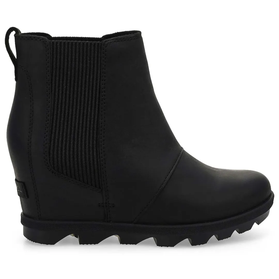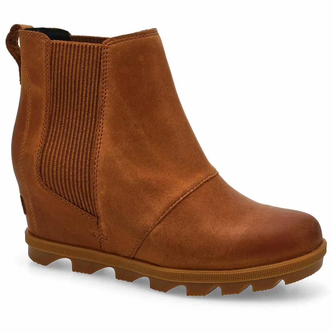 Stay ready for urban adventures with the Joan Rhapsody Chelsea velvet tan/ gum Wedge Boot from Sorel. This ankle-height boot features a waterproof full-grain leather upper with gore panel detailing for easy on-off and a flexible fit. The removable EVA footbed with a soft textile topcover offers cushioned comfort, while the synthetic lining keeps things cozy. Finished with a molded rubber outsole for reliable traction, this sleek wedge boot blends modern flair with rugged practicality.