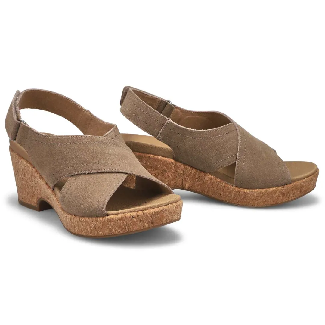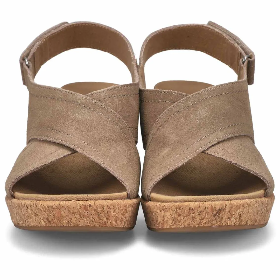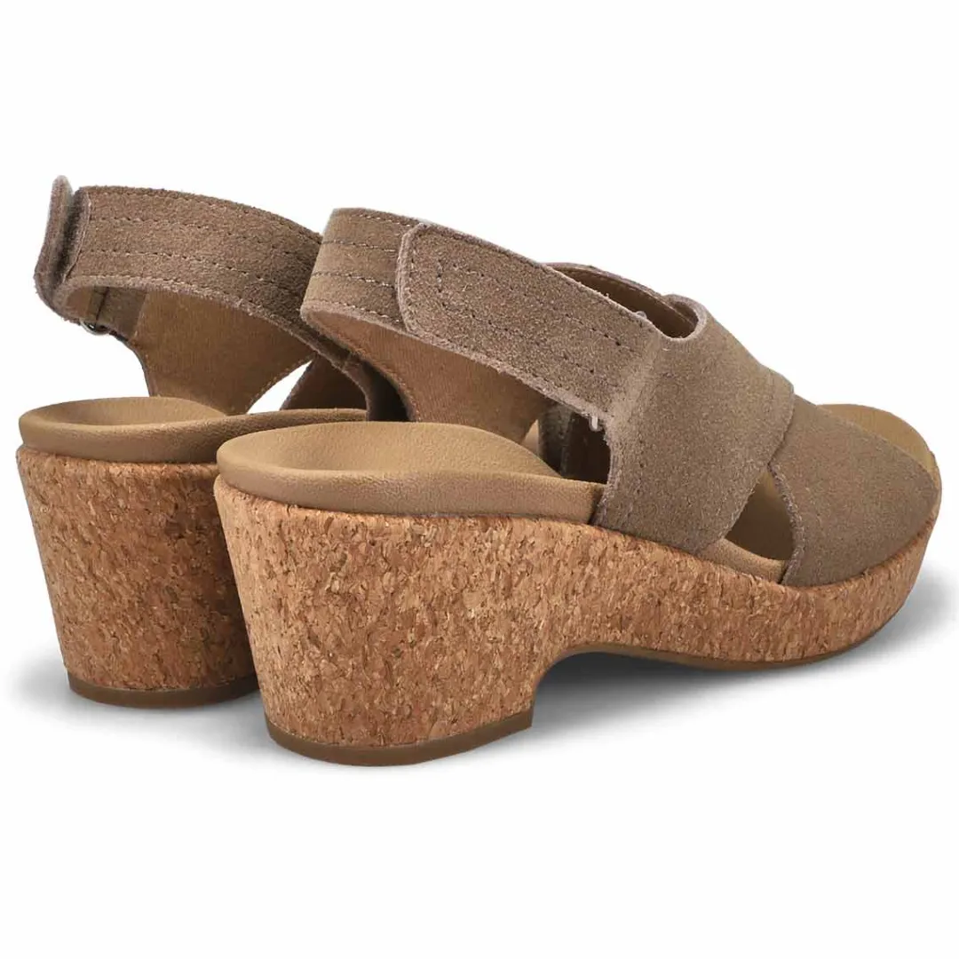 Bring the fierce style with you everywhere wearing the Julie taupe wedge sandal from SoftMoc. Beautiful suede upper in a wedge heeled fashion sandal with cork wedged midsole and lightly cushioned insole. You will want to make the Julie taupe Wedge sandal part of your must-have list for this season!