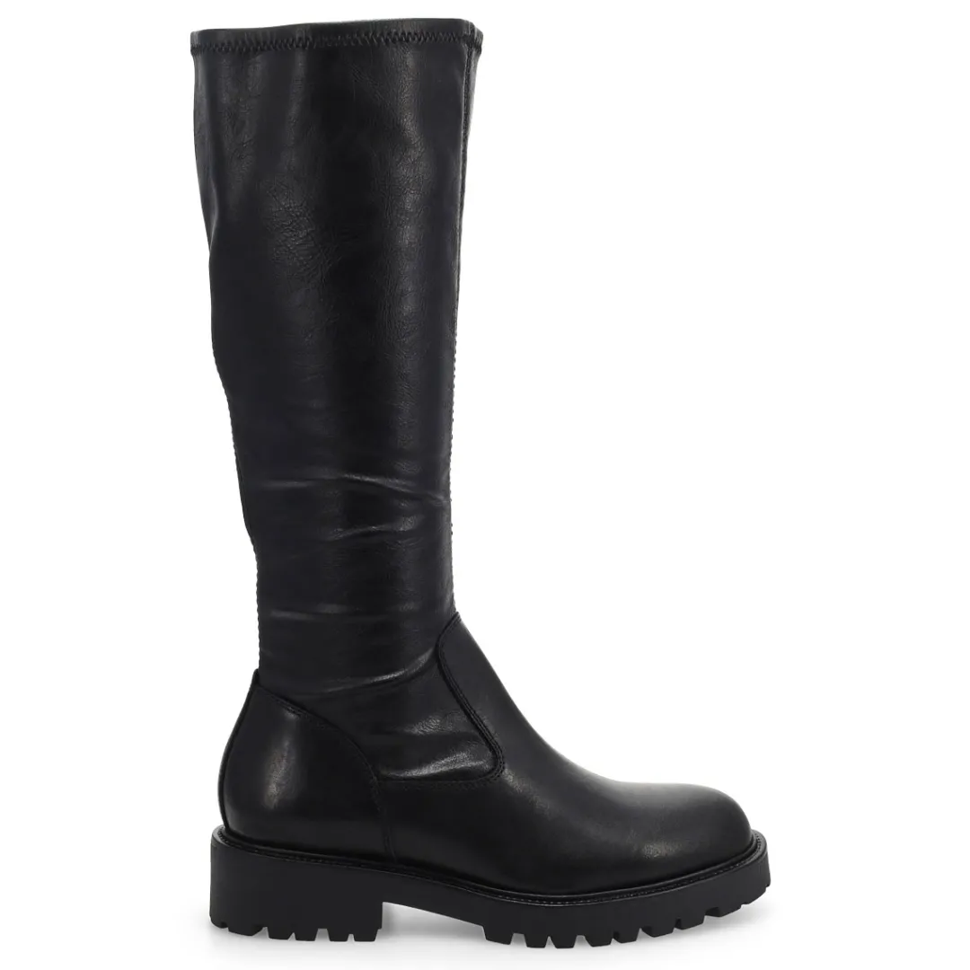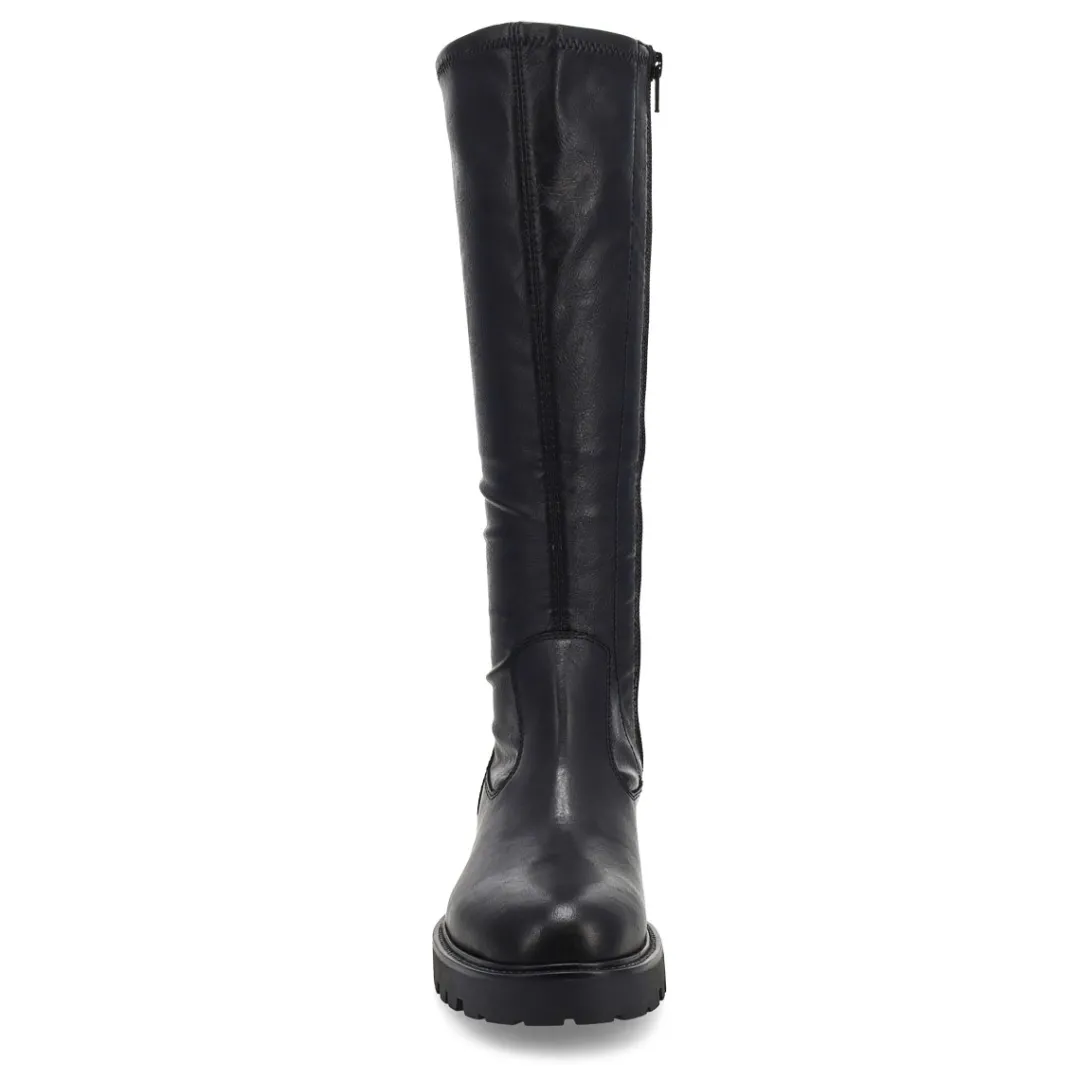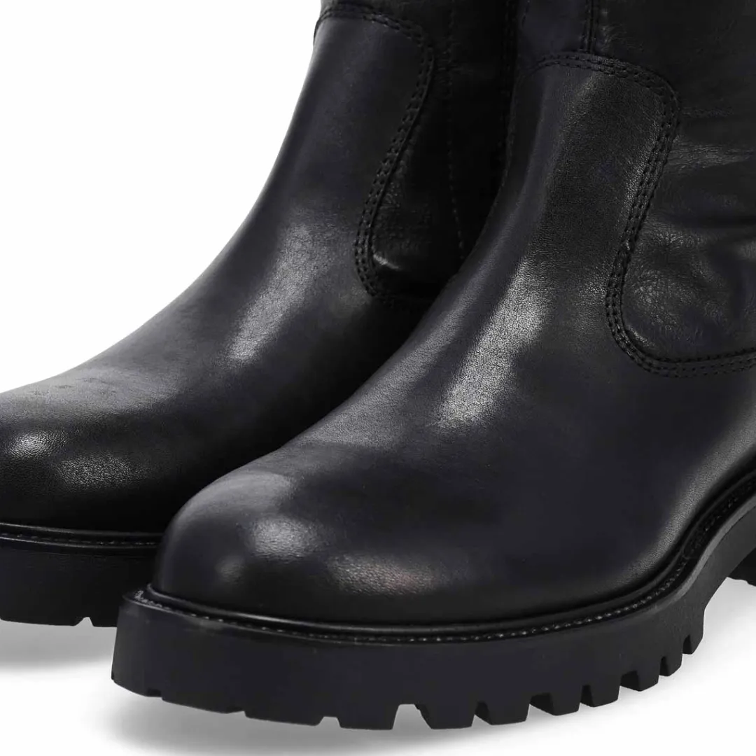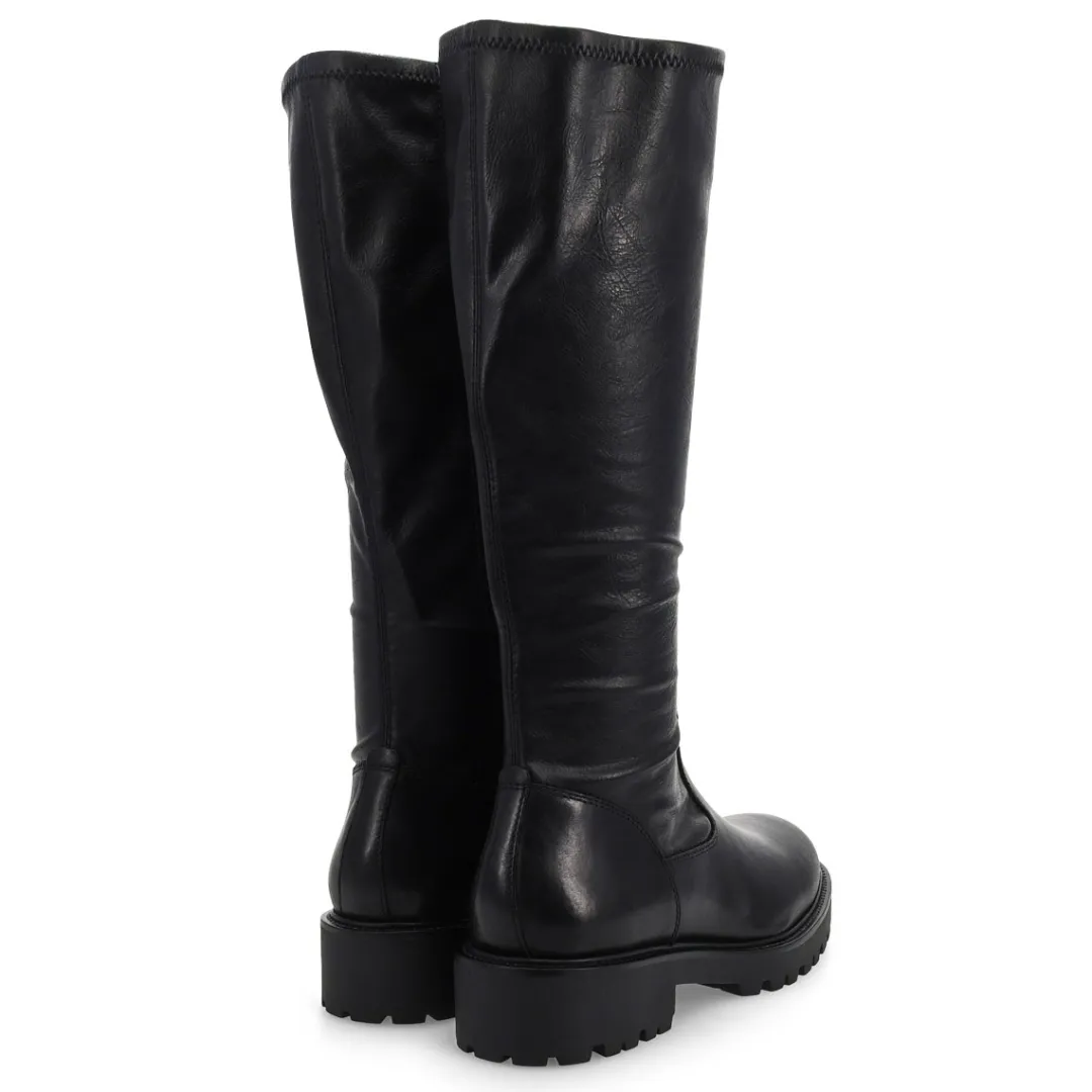 The Kenova black Tall Riding Boot from Vagabond Shoemakers, brings a refined look to this season’s chunky silhouettes. Crafted in smooth black leather, the minimalistic upper is paired with sturdy rubber outsoles measuring 40mm for a subtle lift. The knee-high design is equipped with inside zippers and heel loop tabs for easy wear and removal.
