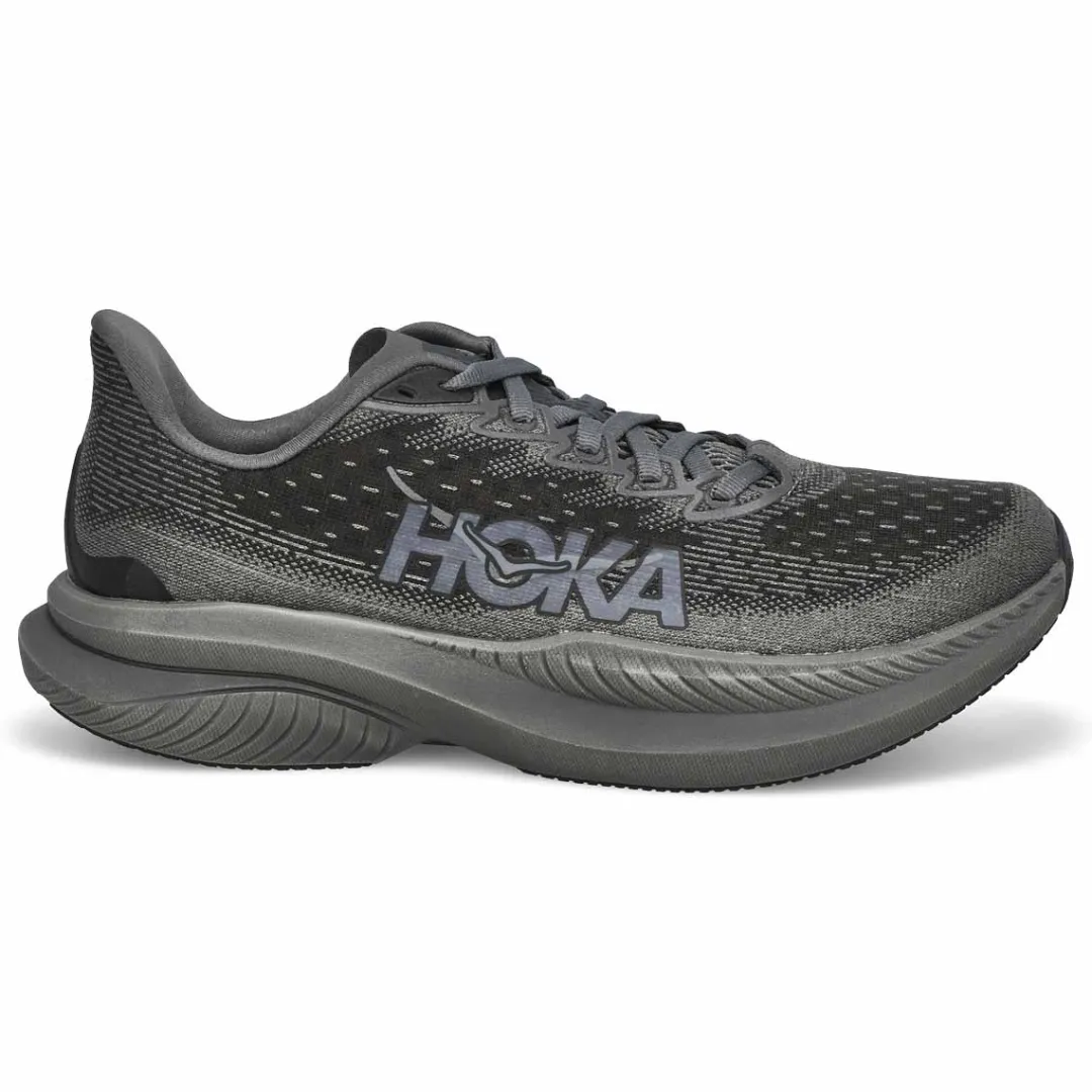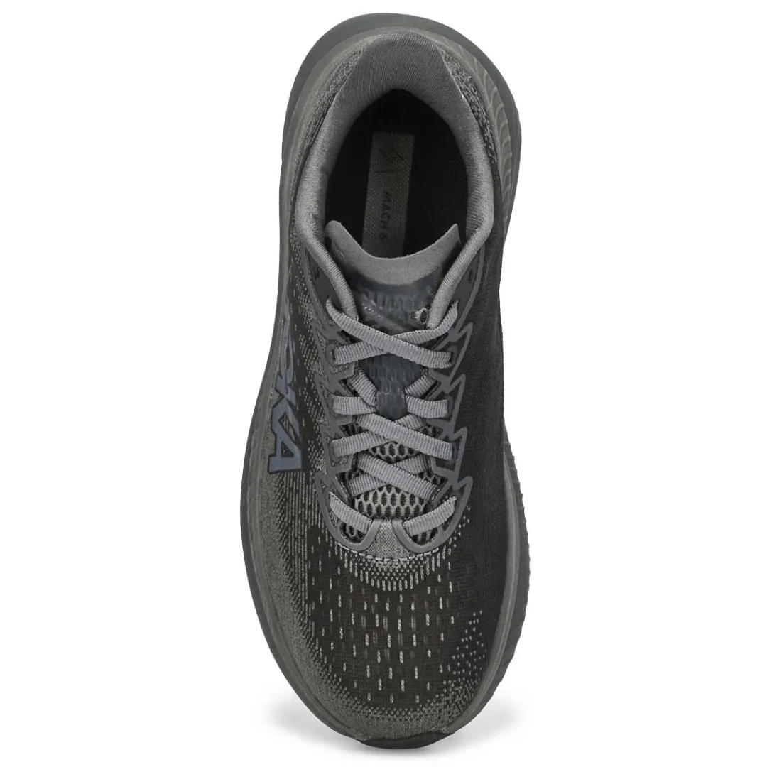 The Mach 6 LA lace up Performance Runner from Hoka is a lively trainer that has been fine-tuned for extra energy return with a super critical foam midsole and updated for enhanced durability with strategic rubber coverage in the outsole. Implementing speed focused design details throughout, Hoka enlisted a new creel jacquard upper with zonal breathability and an internal gusset to deliver the foot-hugging comfort required to set your next PR. Heel-to-toe Drop: 5mm.