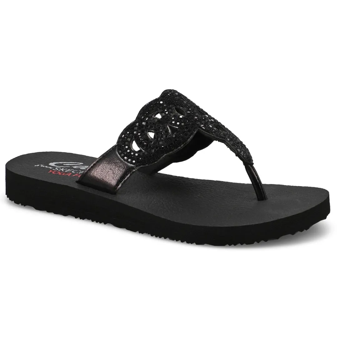 Glam up in style this season wearing the Meditation black/ black Thong Sandal from Skechers. This casual vegan thong sandal features a synthetic upper with rhinestone embellishments and a cushioned Yoga Foam comfort footbed. Crafted with 100% vegan materials. Whether you’re pairing it with flowy dresses or your favorite jeans, the versatile thong silhouette and elegant finish make this a must-have style staple.