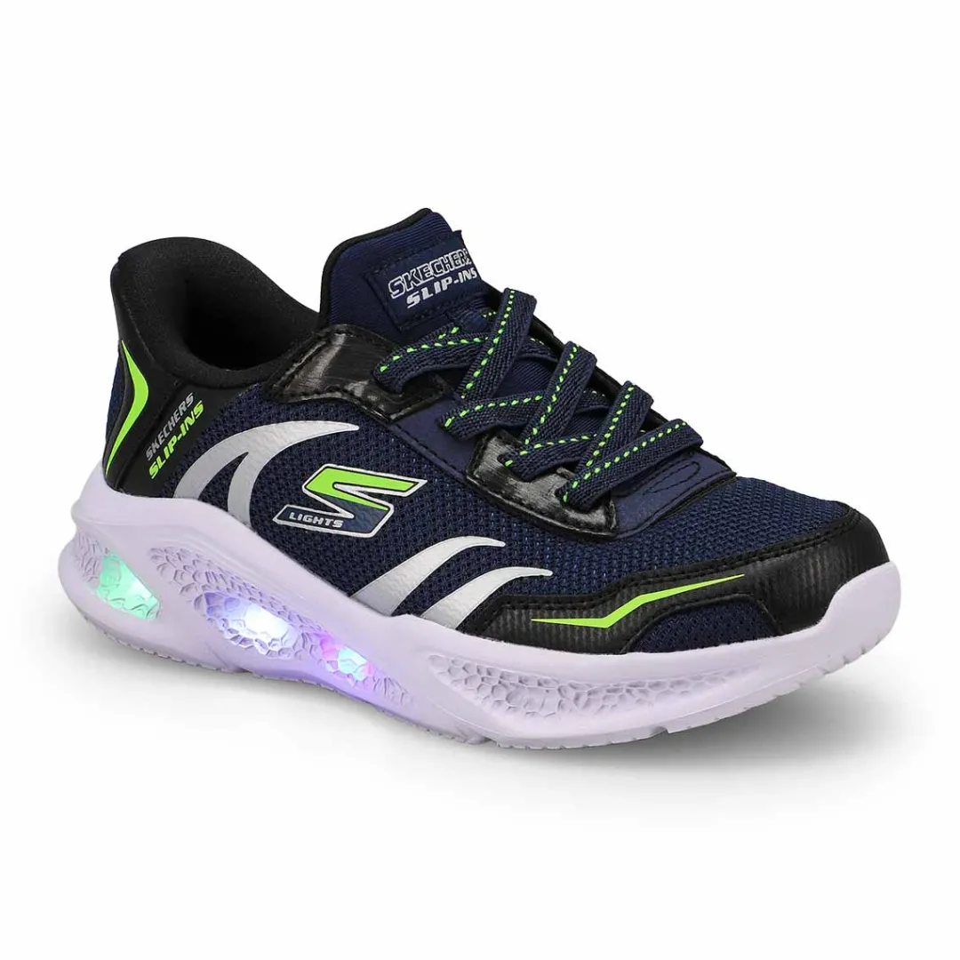 Illuminate your steps in sporty style and comfort with the Hands Free Slip-ins S-Lights: Meteor-Lights Brisk-Beams navy/ black sneaker from Skechers. Designed with Skechers’ exclusive Heel Pillow, this light-up slip-on features a mesh and metallic hotmelt overlay upper with stretch laces, Skechers Air-Cooled Memory Foam insole, and a shock-absorbing light-up midsole.