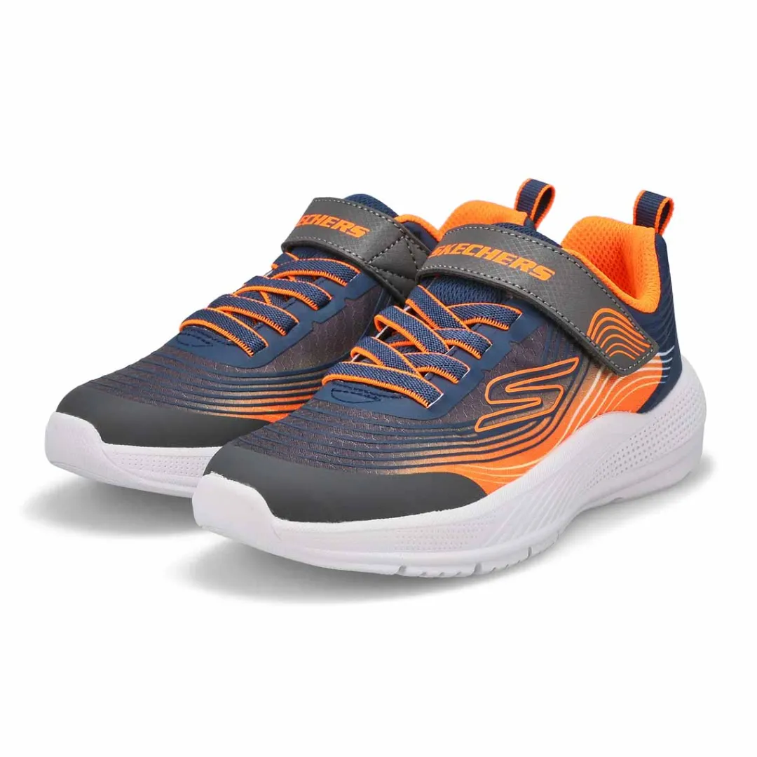 Get active in fun, colorful style wearing Skechers Microspec Advance navy/ orange sneaker. This sporty design features a multicolor mesh upper with haptic print overlay. Stretch laces with hook and loop strap for a secure fit, Skechers Adaptive Closure, and a cushioned comfort insole. The Microspec Advance sneaker from Skechers is designed with a flexible rubber traction outsole.