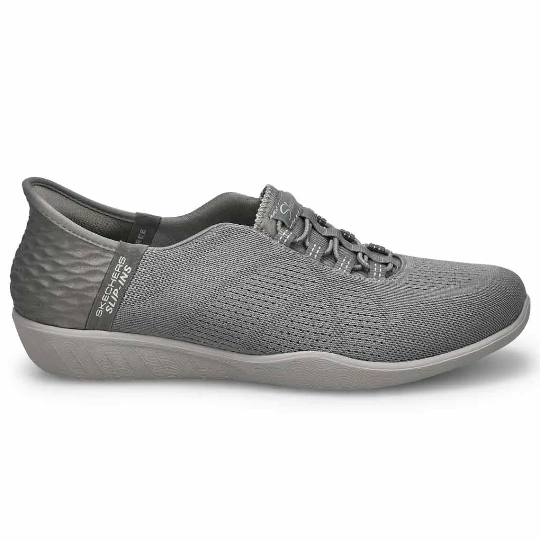 Step into effortless comfort with the Hands Free Slip-ins: Newbury St grey sneakers from Skechers. Featuring a Stretch Fit engineered knit upper with a stretch laced front and a cushioned Skechers Air-Cooled Memory Foam comfort insole. Stretch Fit design for sock-like comfort. Exclusive Heel Pillow holds your foot securely in place.
