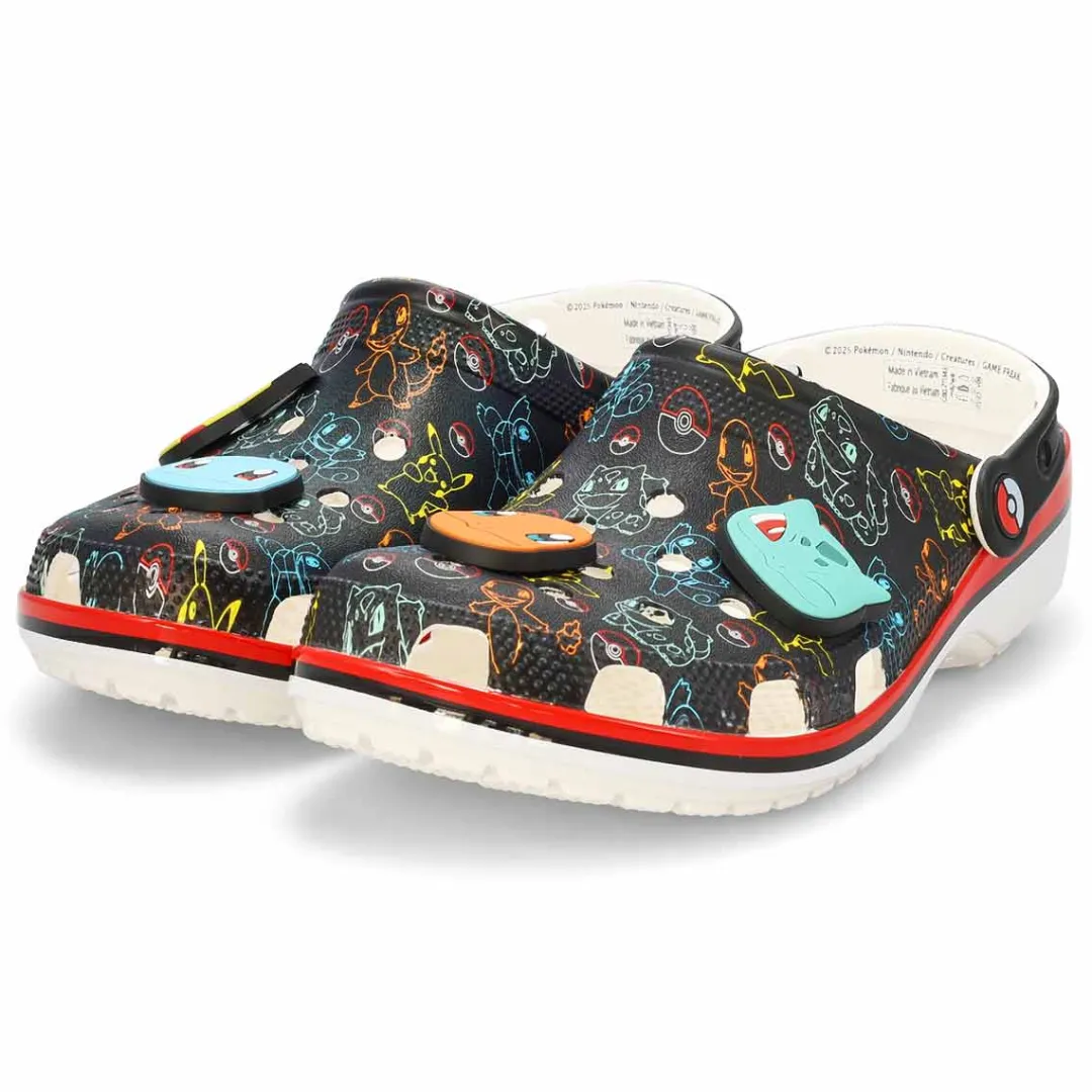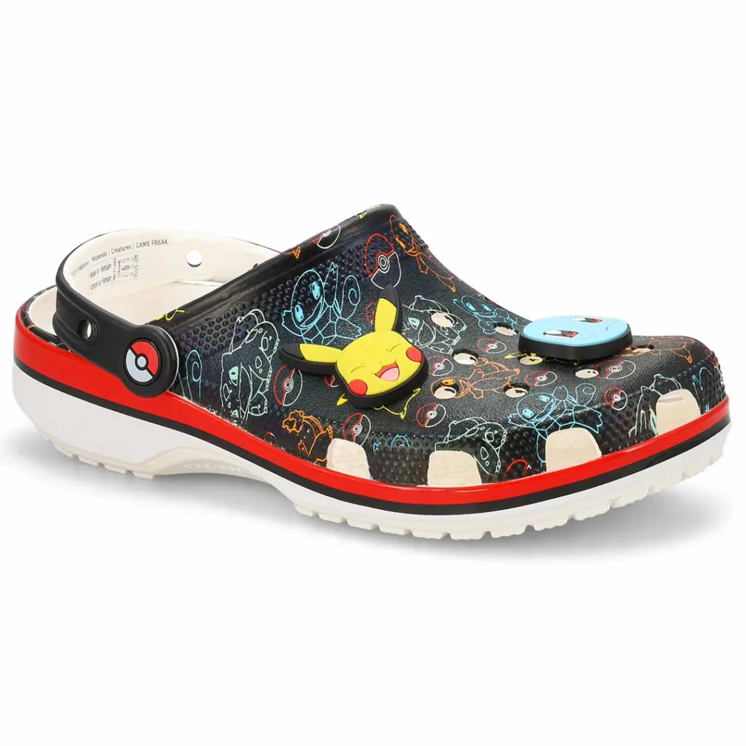 Calling all Trainers! The Pokémon Classic Clog is a fan-favorite silhouette, printed with fan-favorite characters. And oversized Jibbitz charms level up the look even more! Exclusive Pokémon Jibbitz Charms, including Pikachu, Squirtle, Charamander and BulbasaurCustomizable with additional Jibbitz charms. Water-friendly and buoyant. Easy to clean and quick to dry. Pivoting heel straps for a more secure fit.