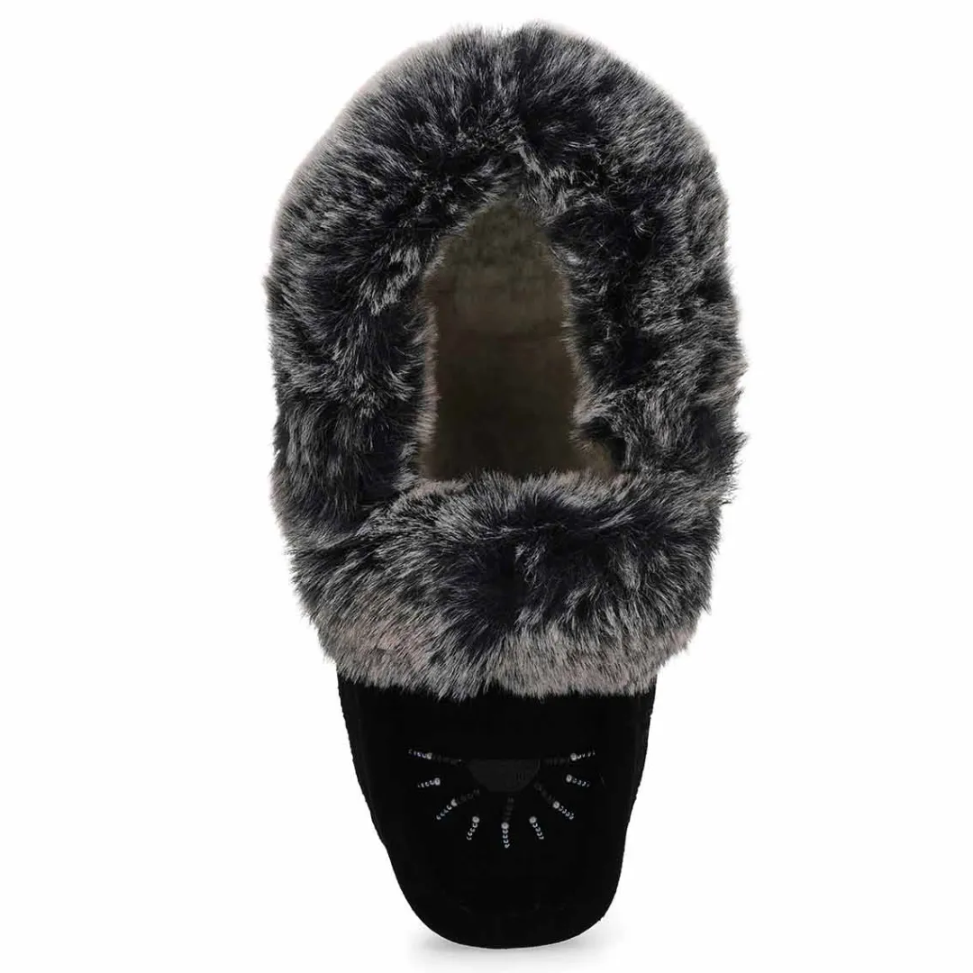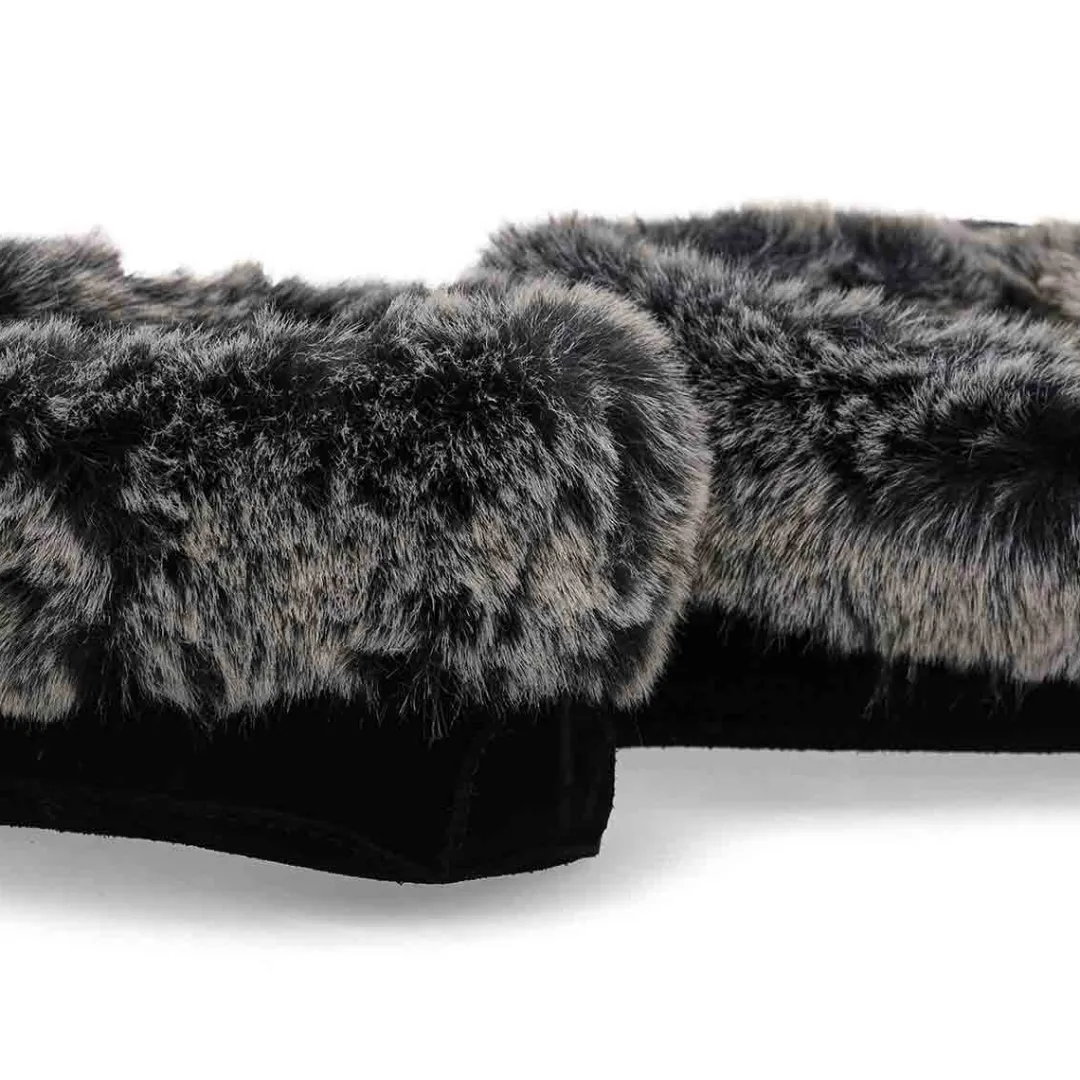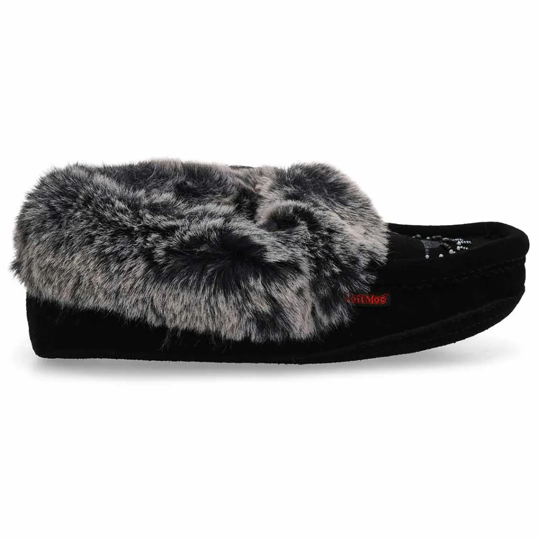 The SoftMoc Punky black faux rabbit fur SoftMocs features a suede upper collared with faux rabbit fur. The Punky is designed with a combination latex and memory foam insole, giving you rebound comfort. The soft suede outsole is intented for indoor use only. Slight dye transfer may occur during the first few wearings. Style is not made for snow or ice conditions.