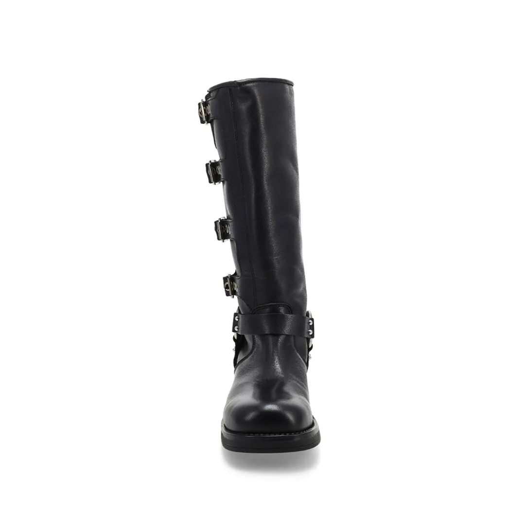 The Rockyy brown Knee High Boot from Steve Madden features the wide profile of an engineer boot with harness and buckle hardware adding an industrial edge and giving the design an adjustable fit. Top gore with 4 adjustable buckle straps. Block heel engineer boot design. Leather upper with breathable textile lining.