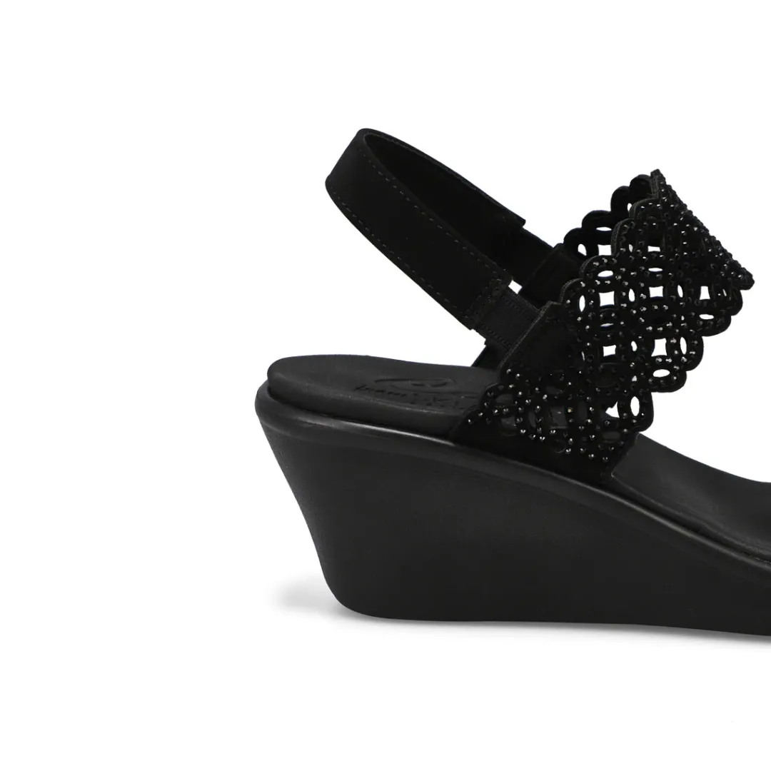 Glam style comfort and looks combine in the Rumble On Sassy Dayz black/black Wedge Sandal from Skechers. This wedge sandal features a rhinestone embellished laser cut vegan leather upper with a pull-on slingback strap and a cushioned Luxe Foam footbed. Match warm-weather style with toe-to-toe comfort from Skechers contoured well-cushioned Luxe Foam footbeds.