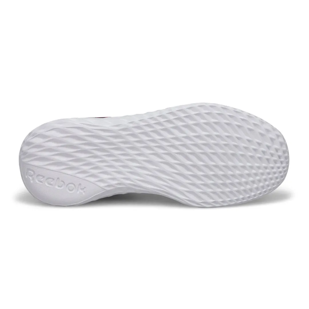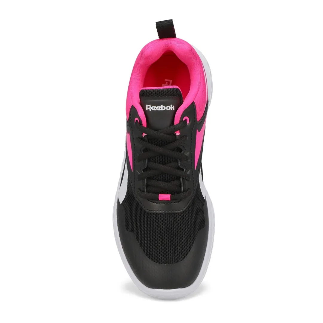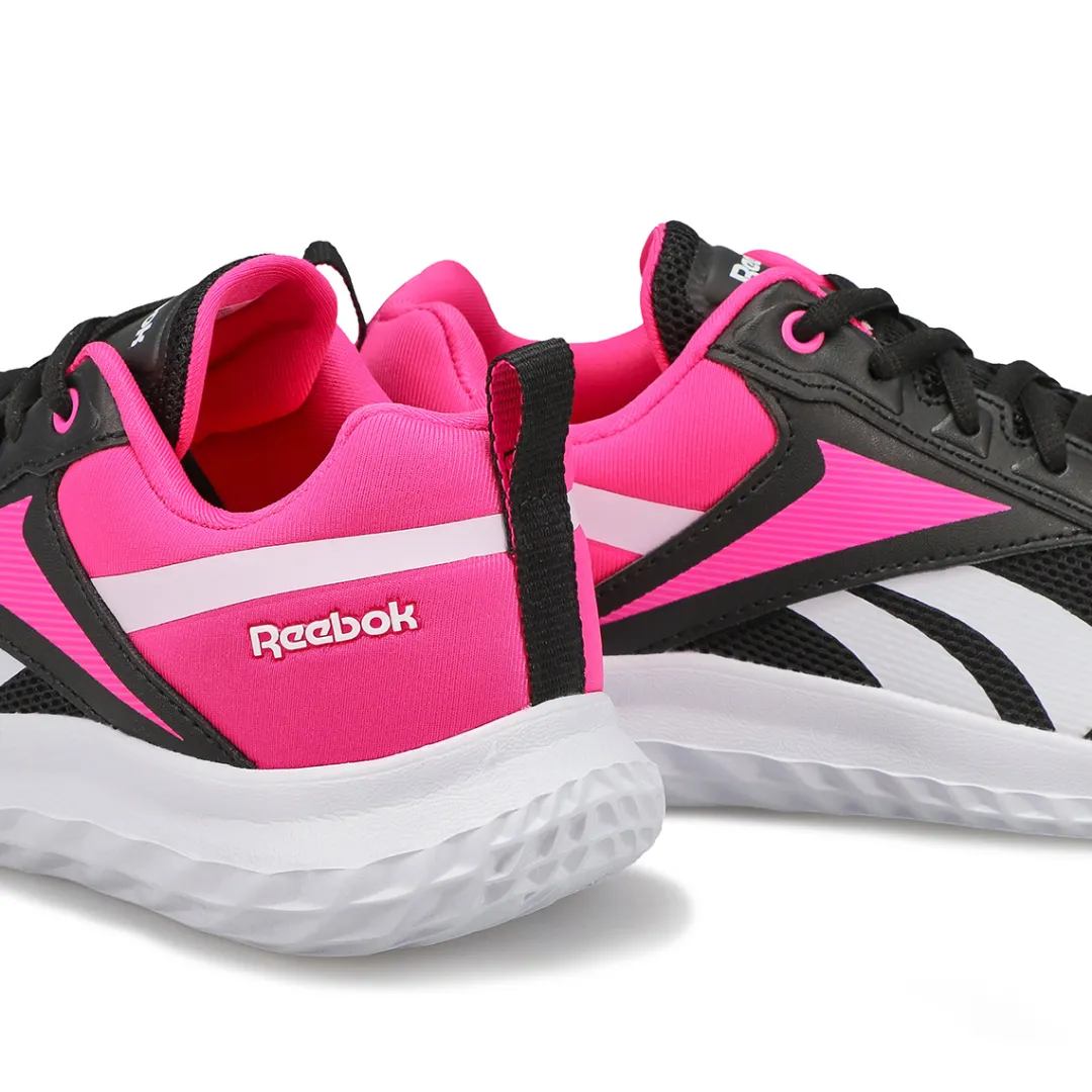 They play hard. These Rush Runner black / pink sneaker from Reebok are built for support on the playground and beyond. The textile upper with synthetic overlays is lightweight and comfortable, and the iconic Vector logo adds athletic style. The EVA midsole provides underfoot cushioning for running, jumping and climbing.
